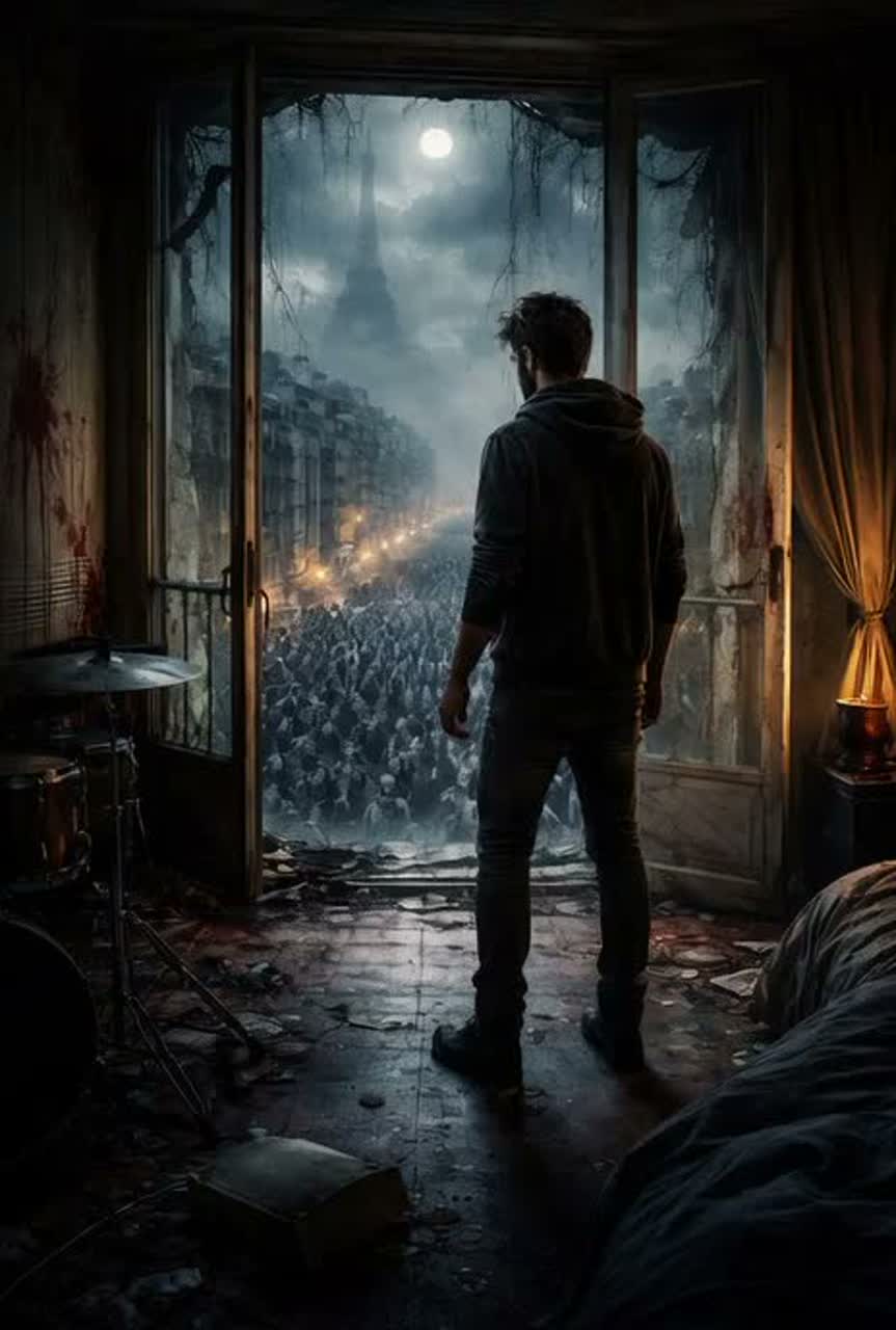 Dark horror trap, cinematic post-apocalyptic rap, 148 BPM, [Soundscape: distant Paris wind swallowed by fog, elevator cables creaking, rain tapping old Haussmann windows, breath in a frozen stairwell, sudden silence like the whole city stopped blinking, ] Massive subterranean 808s, heartbeat kicks, distorted low brass stabs, granular choir smears, detuned piano drops, metallic clanks, reverse textures, sickly synth haze, and occasional industrial impacts, Verses are tense, intimate, half-whispered rap with sharp internal rhyme and paranoia in the delivery, Chorus opens into a haunted melodic hook with layered doubles and ghostly female whisper harmonies, Keep the mix claustrophobic and dry at first, then widen into rooftop dread and firelit chaos, The drop should feel like silent zombies sprinting with no scream, only motion, Elegant, brutal, nocturnal, lonely, psychological, cinematic