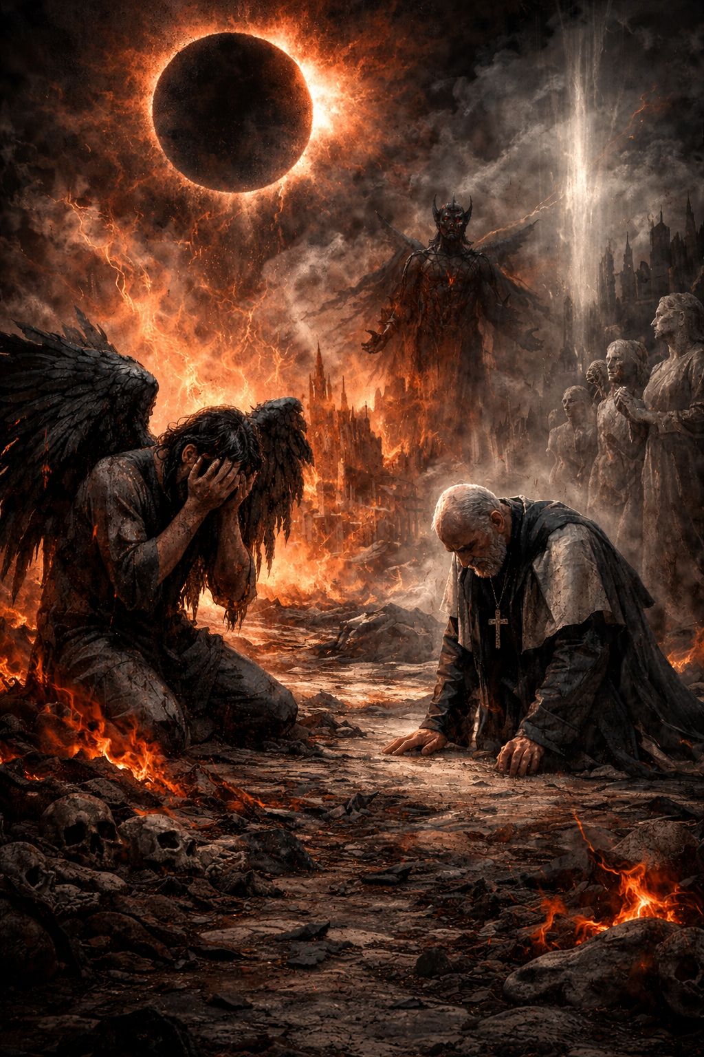 Dark cinematic apocalyptic rock with orchestral elements, Slow to mid tempo, dramatic and atmospheric, Deep emotional male vocals, выразительные, немного надломленные, с нарастающим напряжением, Verses restrained and ominous, minimal instrumentation, distant pads, low piano, subtle pulses, Explosive, epic chorus with huge drums, distorted guitars, hybrid orchestral hits, dark choir textures, Mood tragic, prophetic, end-of-the-world energy, Massive dynamics, tension build-ups, haunting ambience, thunderous impact, emotional and catastrophic