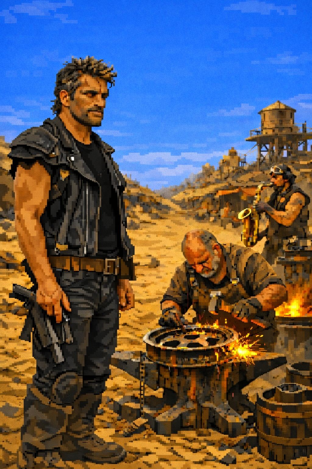 80s Hard Rock, New Wave, 118 BPM, Gated Reverb Drums, Gritty Female Rock Vocals, Raspy Soulful Belting, Heavy Power Chords, Iconic Saxophone Solo, Synth Bass, Anthemic, Post-Apocalyptic Cinematic Energy, 1985 Production Styl, cinematic dark ambient industrial, style wasteland soundscape, tense atmospheric drone, percussive scrap-metal and anvil orchestra, primitive tribal low bagpipe drones, no vocals no chants, raw acoustic metallic percussion only, unsettling slow tension build, cold desolate post-apocalyptic feel, haunting processed synth pads from forge sounds, subtle orchestral swells, heavy bellows roar, chain rattles, epic film score percussion without melody overload, immersive radiation hum