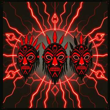 Create a dark, high-energy fusion of hard electro breakbeat and tribal sub-Saharan afrobeat at 95 BPM, Start with a 30–40 second build of clean guitars, deep bass pulses, atmospheric pads, shaker patterns, and talking-drum textures, Drop into aggressive breakbeat drums with sharp snares, rapid hi-hat rolls, and thick electronic kicks layered over traditional afrobeat percussion, Add call-and-response guitar riffs, chanting rhythmic motifs, and evolving synth stabs, Include two intense instrumental breaks separated by a short ambient pause with echoing percussion and reverb-drenched textures, Mood: primal, electrified, driving, ritualistic