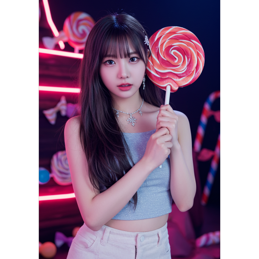 High-energy K-pop/J-pop EDM dance-pop, BPM 144, Bright synth leads, funky bass, plucky guitars, side-chained pads, punchy claps & hi-hats, tight sub-kick, Dual female vocals with playful call-and-response, Anthemic English chorus with addictive chant โCandy thief!โ, No rock guitars, no ballad break, Keep runtime ~2:50
