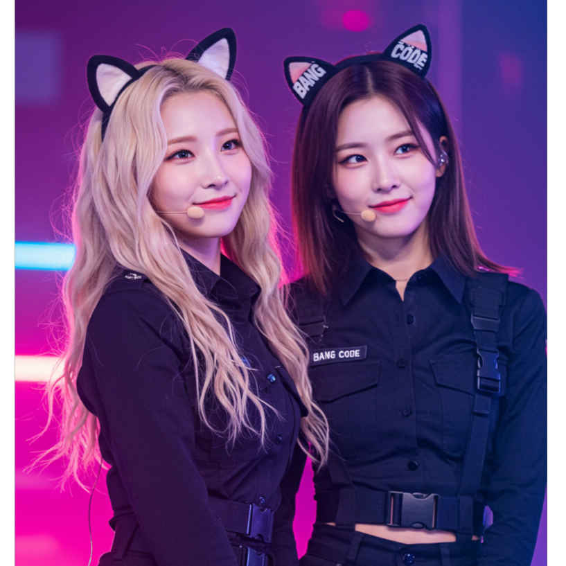 Up-tempo K-pop hybrid, trap brass stabs, glitchy synths, bouncy future bass, dual female vocals (rap + sweet tone), powerful & playful with Korean phrases