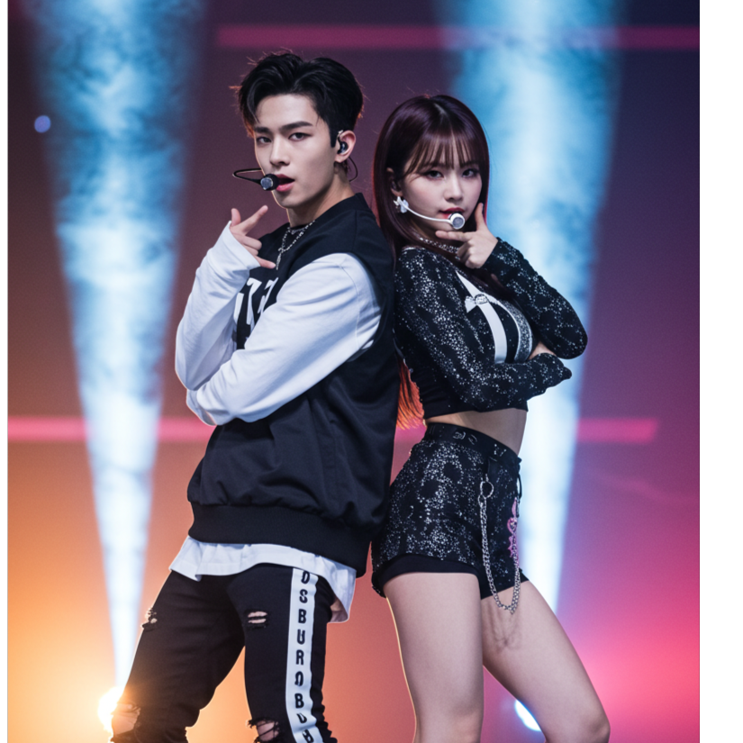 A high-energy K-pop dance hybrid that fuses distorted electric guitars, glitchy synths, and trap beats with fiery male rap and powerful female vocals, Designed for performance stages, this track features fast rap flows, shout-along choruses, and explosive instrumentation with brass stabs, sub-bass drops, and layered FX, Perfect for a stadium anthem