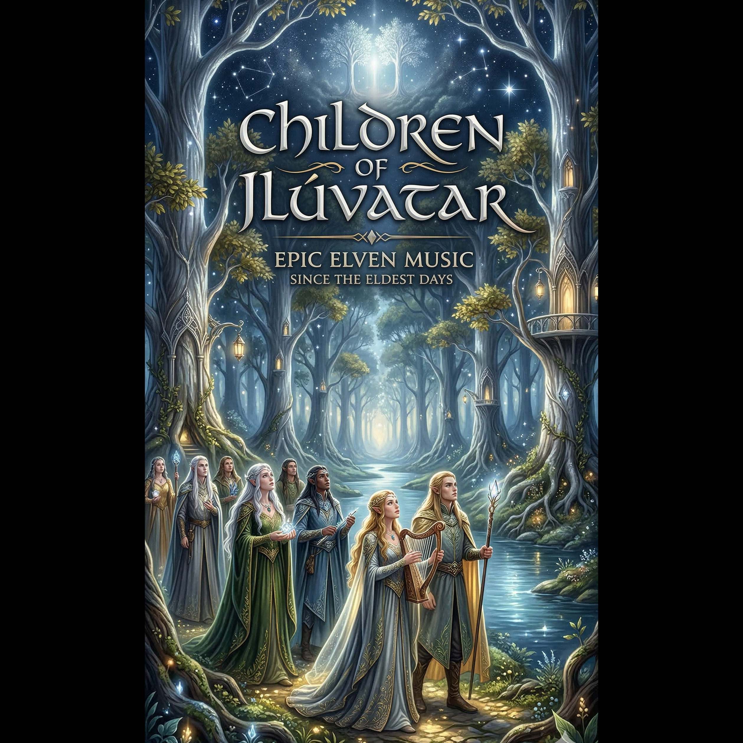 Extremely long solo harp introduction, ethereal celestial female vocals, vocals in duet with harp, harp obbligato, melodic accordion, no drums, no percussion, acoustic chamber folk, heavy reverb, soft synthesizer pads, Quenya lyrics, slow-tempo, haunting atmosphere, high fidelity