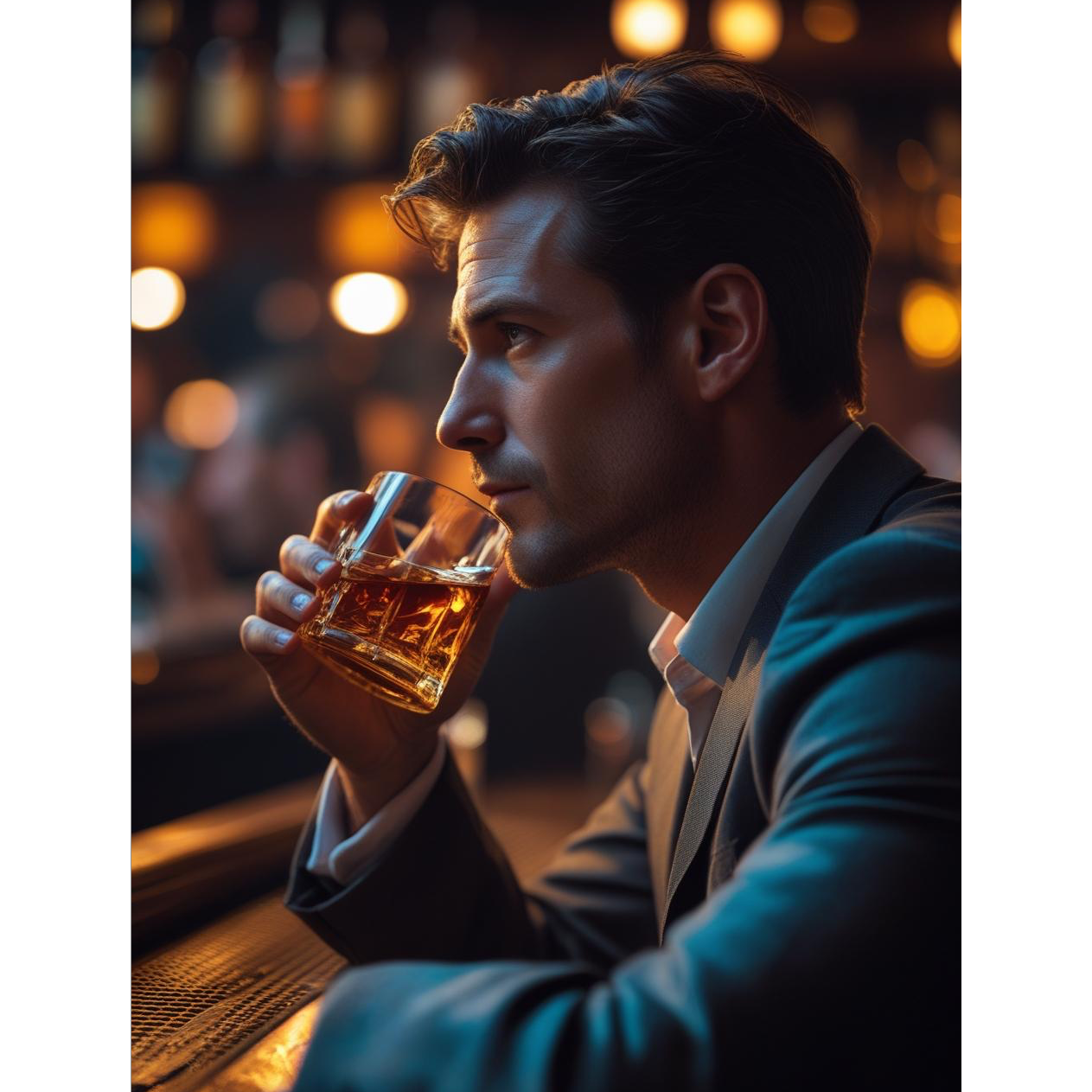 Il is a slow and moist jazz ballad, The main is the soft rhythm of piano and wood bass, brush snare, The acoustic guitar is a light chord stroke or arpeggio, Occasionally, the saxophone is short and adds melancholy, creating a sense of atmosphere in the bar, The tempo is around 65 BPM, and the swing feeling is small and the ballad feeling is flowing, The male vocals have calm bass and quiet singing like a whisper, The whole mood is suitable for the tranquility of the city night and the sound of ice in the glass, Mood: Sweet and bittersweet adult lounge jazz, late night alone time