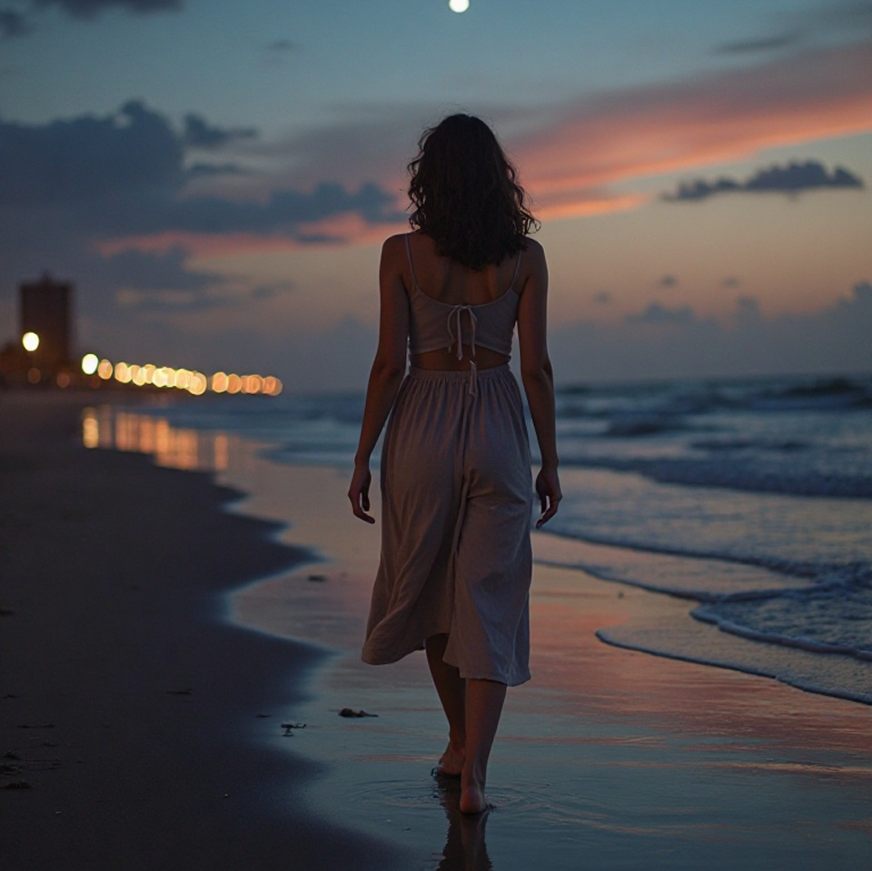 Female vocals, Japanese lyrics, A jazzy R&B ballad about the serenity of a summer night by the sea and the delicate feelings for a man, The tempo is slow to medium-slow, with rich electric piano and jazz guitar, delicate wood bass and brush drums creating an urban mood, The arrangement has a deep, floating chordal feel, with a sense of transparency and adult melancholy; the emphasis is on a clear, high-quality sound image, not including lo-fi elements, The arrangement creates a mellow and sentimental atmosphere that accompanies a scene of standing alone by the seashore at night