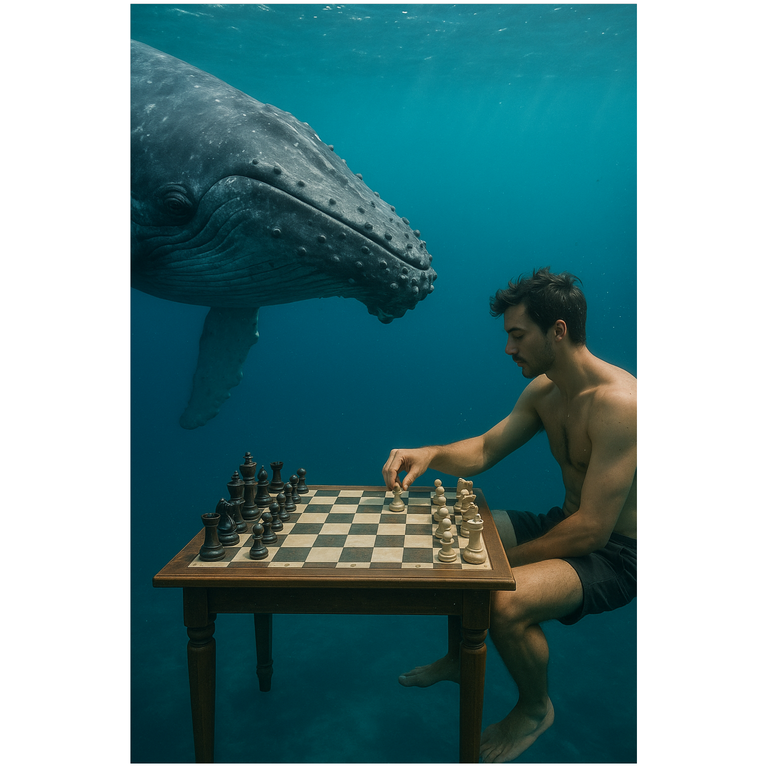 Create an ambient–symphonic vaporwave soundscape where the human and oceanic worlds blur into one continuous dream, Use whale song phonemes and theremin leads as melodic voices — bending, sighing, and calling like lost language fragments, Layer lush analog synth pads, soft orchestral strings, and slow tidal percussion that rises and falls like breathing, Include sub-bass drones that pulse with oceanic depth and faint field recordings of water pressure and bubbles to create immersion, The theremin should serve as a bridge between the human voice and whale communication — gliding, shimmering, emotional, Build slowly from a deep hum into a sweeping, shimmering crescendo, then dissolve into filtered reverb and distant echoes as if fading into the abyss, Maintain a meditative, awe-filled mood throughout, equal parts wonder and melancholy, Radio-ready, cinematic, richly textured, Mood: Dreamlike, mysterious, sacred, Tempo: 65–75 BPM (slow tidal flow), Key suggestion: D minor or E Dorian