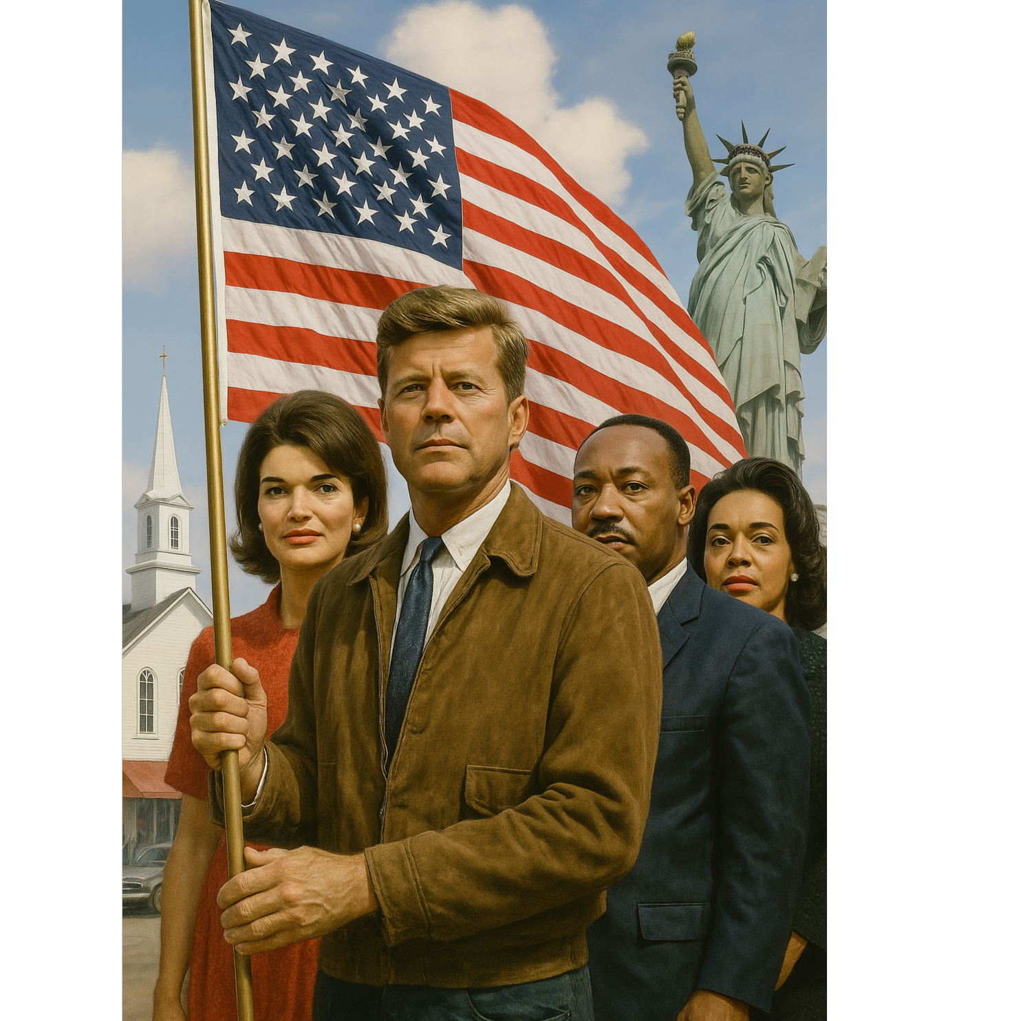Create a cinematic spoken-word rap duel between two historic figures: one smooth and presidential (John Fitzgerald Kennedy accent), the other passionate and soulful (Martin Luther King Jr, ), Blend old-school boom-bap hip-hop beats with orchestral brass, snare rolls, and faint radio static, Include historical newsreel ambience, ticking clocks, and subtle vinyl hiss, The ending swells into a reverb-drenched, slowed-down instrumental of the U, S, national anthem with layered echoes of both voices repeating “freedom” and “dream, ”