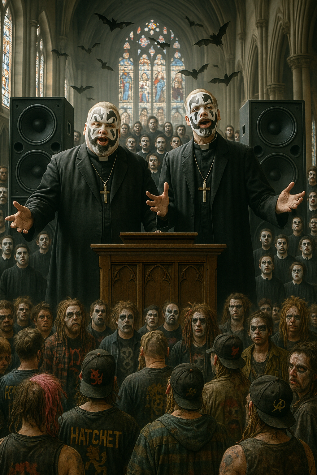 Big halftime stomp beat, Guitar: palm-muted chug + octave slides into bass hits, FX: reverb throws on chorus endings, preacher megaphone bridge, Backing Vocals: gospel power stacks, More distorted bass like SNOW MADNESS(JUGGALO SHOVEL ANTHEM)