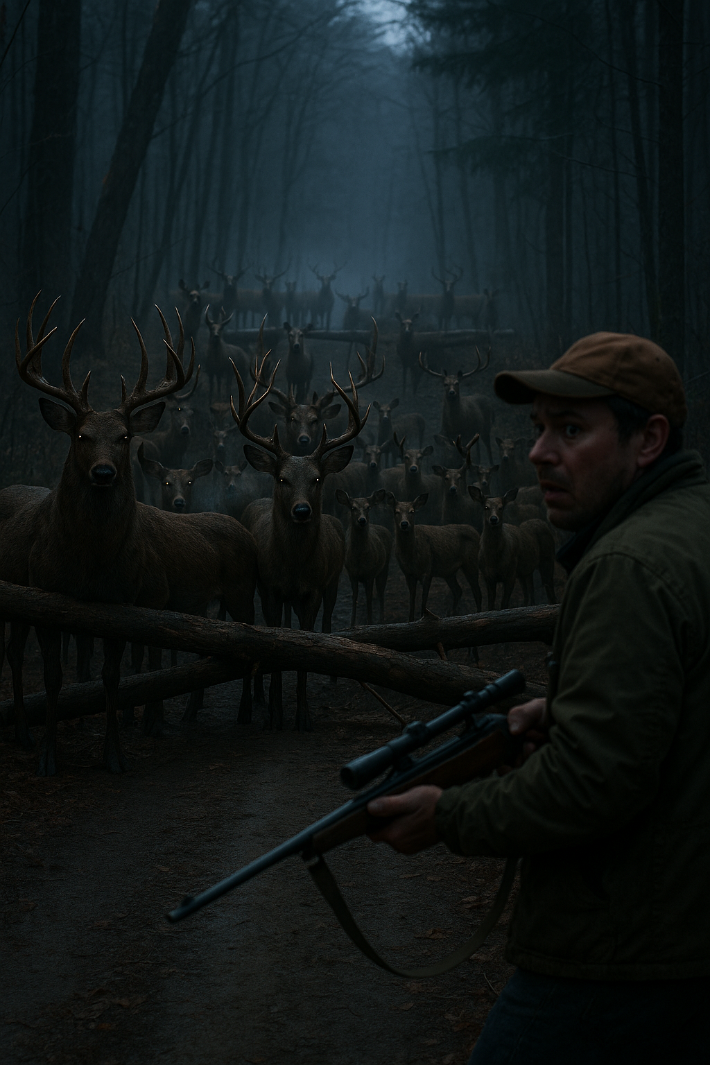 SFX: forest wind • twig snaps • distant deer calls • creaking trees • subtle heartbeat thump • low sub rumble