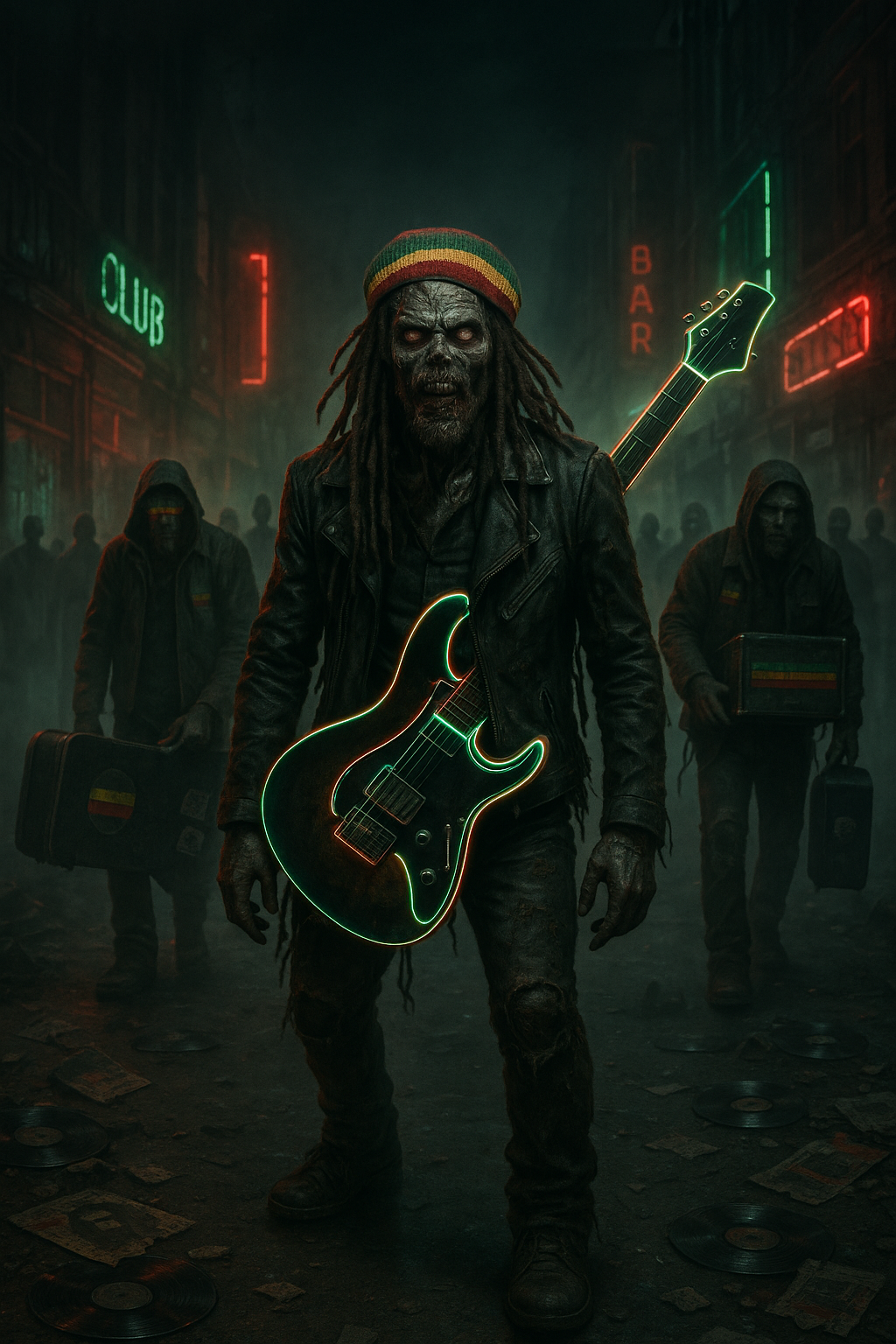 Slow, grinding industrial-metal track inspired by Rob Zombie’s Dragula and Living Dead Girl, Detuned chugging guitars with a dirty overdriven tone, mechanical stomping drums, metallic percussion hits, and a thick distorted bass, Spoken-growl lead vocal with sneering attitude, layered with whispered backing vocals for creepy swagger, Occasional robotic vocal effects and megaphone distortion, Cinematic horror synth accents and glitchy transitions between sections, Tempo around 90 BPM, heavy half-time feel, Dark, stylish, PG-13 “shock rock” energy — sleazy but fun, thick groove, massive stomp riffs, Keep the provided lyrics exactly as written with no changes, A dark industrial reggae-metal fusion, Syncopated reggae drum machine beat inspired by a Roland CR-78 with strong offbeat skanks and classic dub bass movement, Titan Bass DUB Drone modulated at 97Hz, deep and growling, Yamaha contrabass at 97Hz anchoring the low end like a heavy dread bass wall, Sleazy distorted electric guitars wit