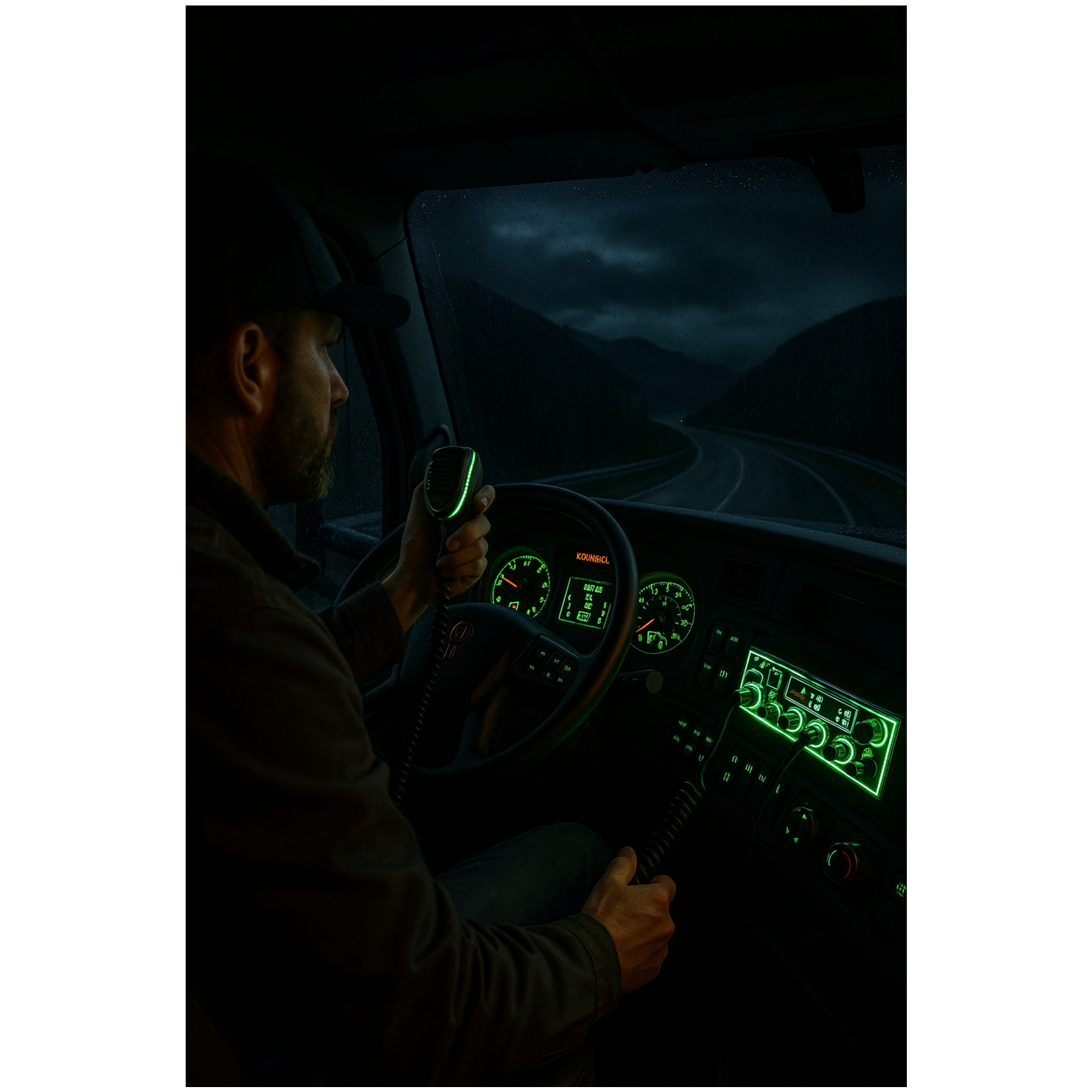 STYLE: cinematic country • storytelling country • Americana • night-driving atmosphere • emotional • ghostly • CB radio transmissions • sparse verses • big heartfelt choruses