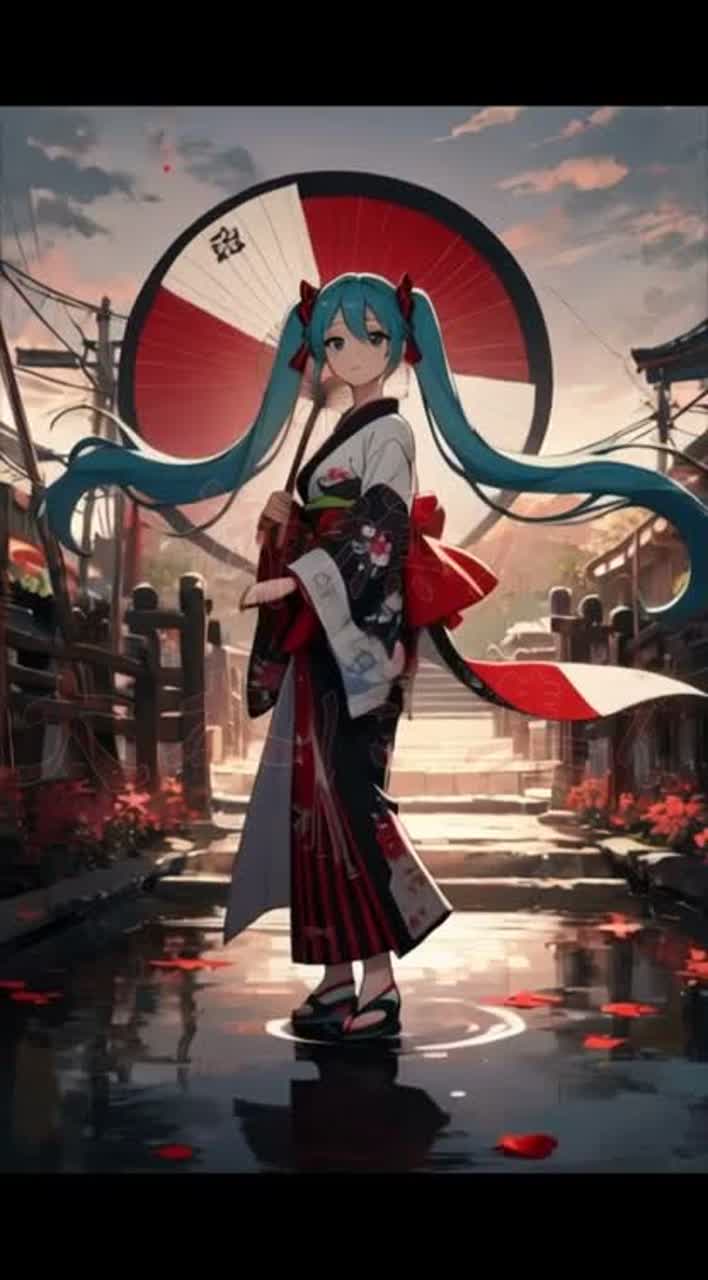 miku, Vocaloid vocals, This energetic Japanese festival rock track features Miku's distinctive Vocaloid vocals, a powerful taiko drum beat, and a blend of traditional and electronic festival instruments, It features a fast tempo, major keys, and a dynamic arrangement that gradually builds in intensity, The lead vocals are clear and powerful, with multiple layers of harmony, The instrumentation consists of a koto, a powerful bassline, and synthesizers that create melodic counterpoint and a unique atmosphere, The vocals are accented with reverb, and the production features a clear, punchy mix that complements the taiko drums and lead vocals, The song follows a typical verse-chorus structure, with an instrumental break and bridge that allow new melodic ideas to emerge
