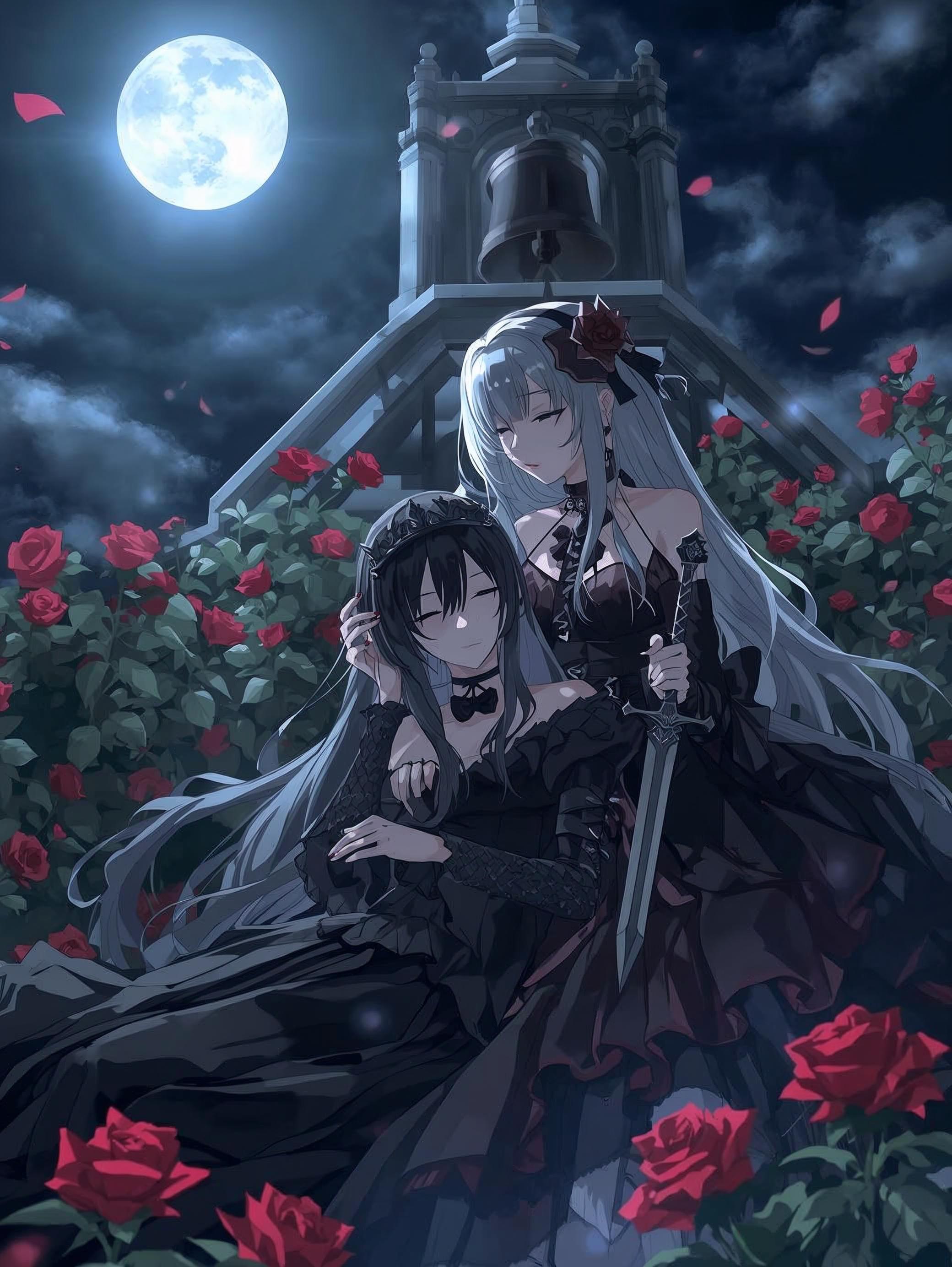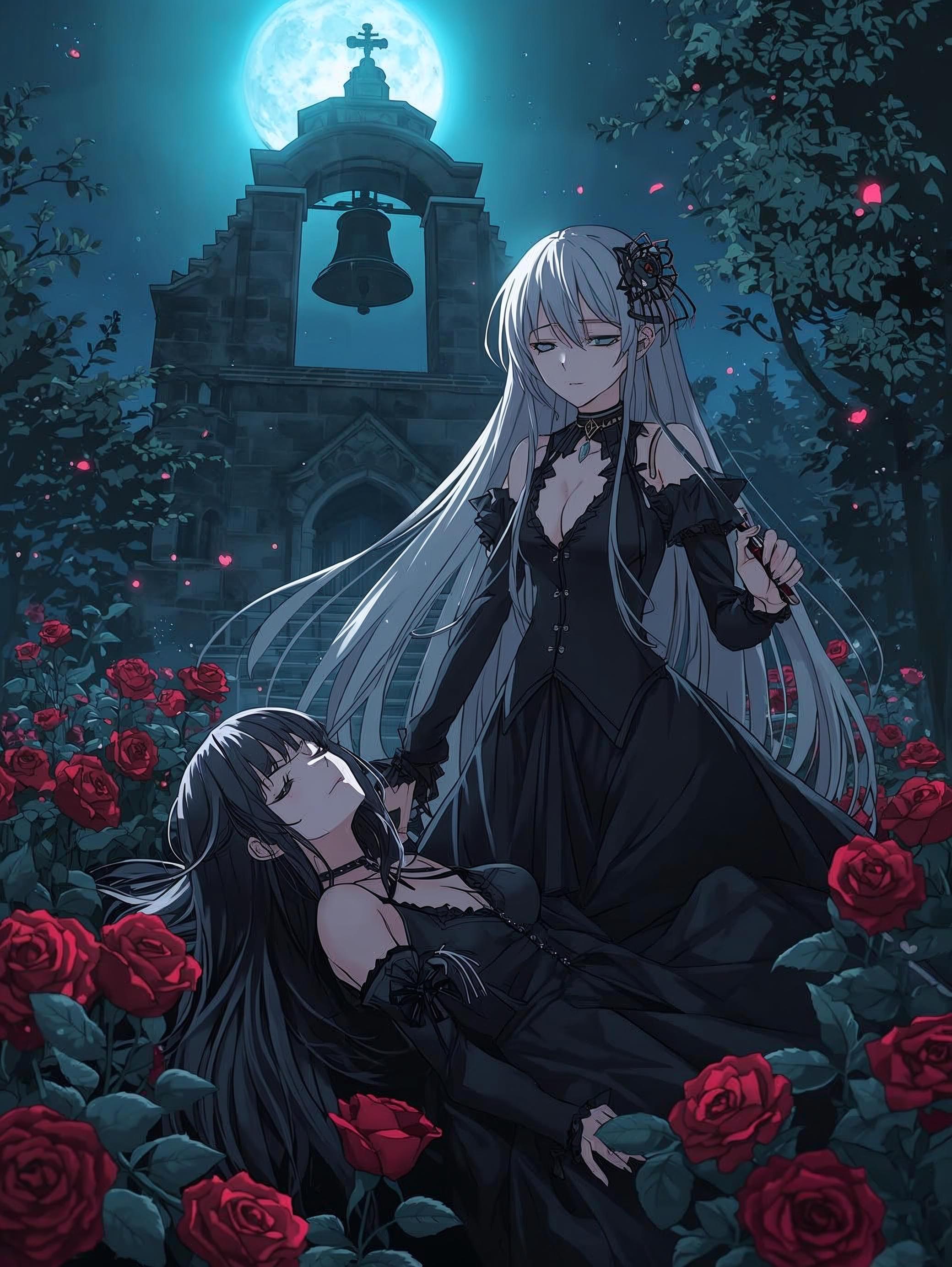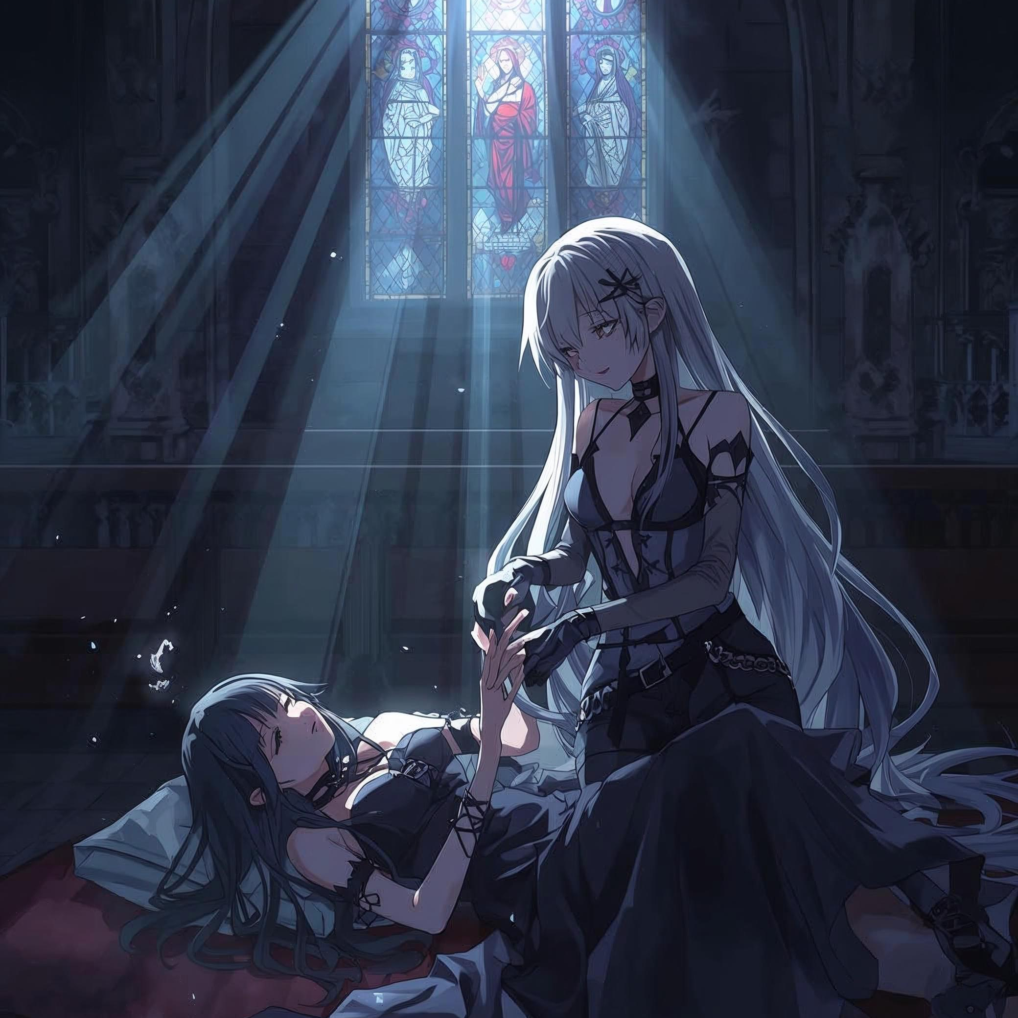 Two close women, (B) loves (A), (A) hides she is a spy sent to kill (B), (B) already senses the truth, Their love turns into a curse, Final scene: (A) dies in (B)’s arms — beautiful and terrifying, Language: Japanese lyrics, Dynamic progression: quiet eerie verses → powerful symphonic choruses → dark tragic finale