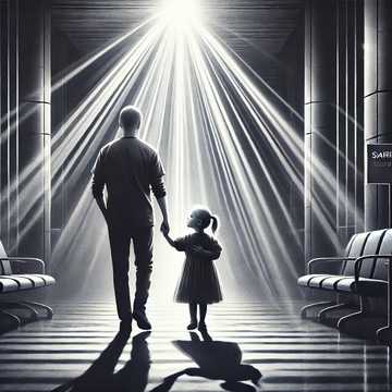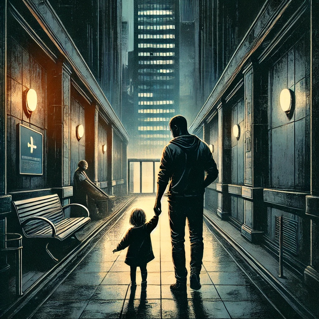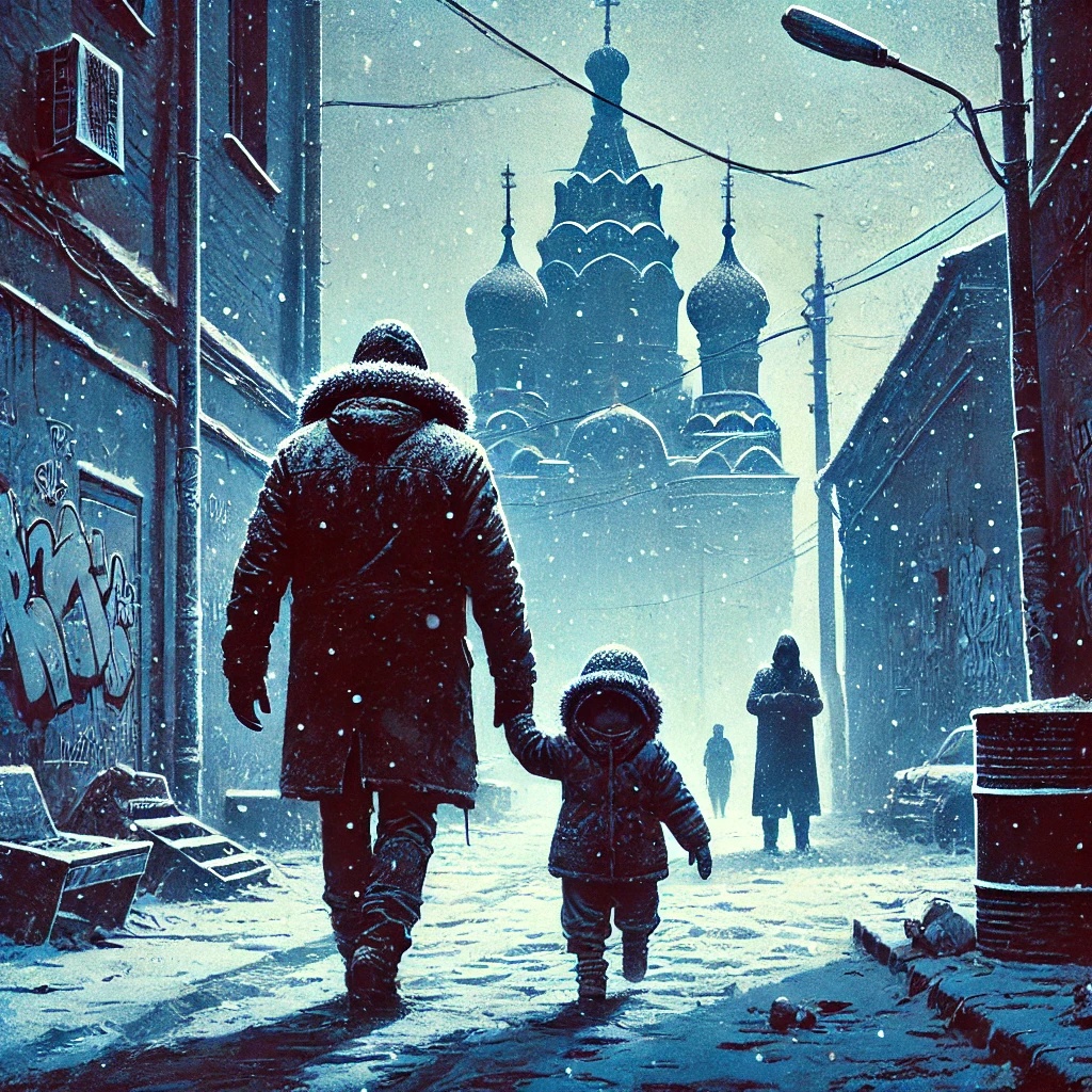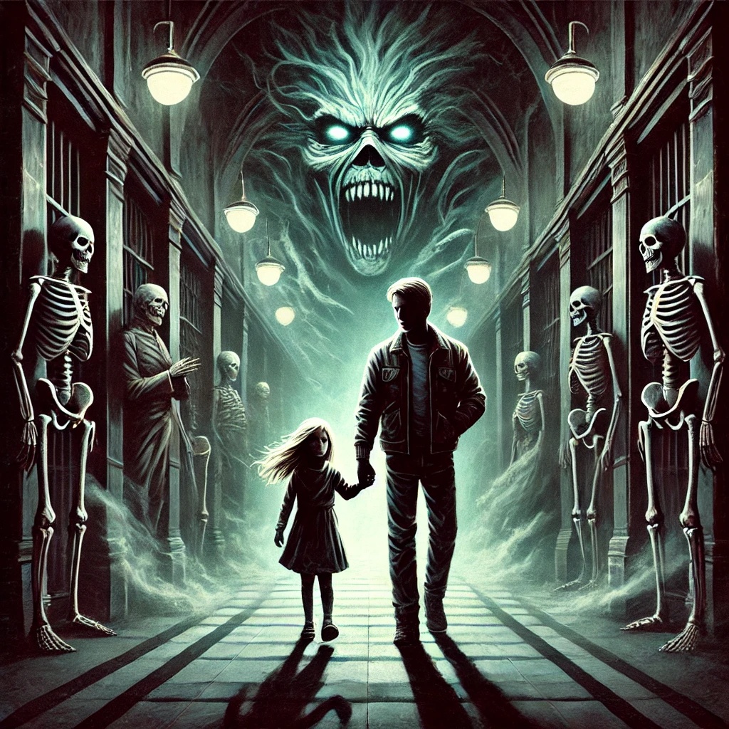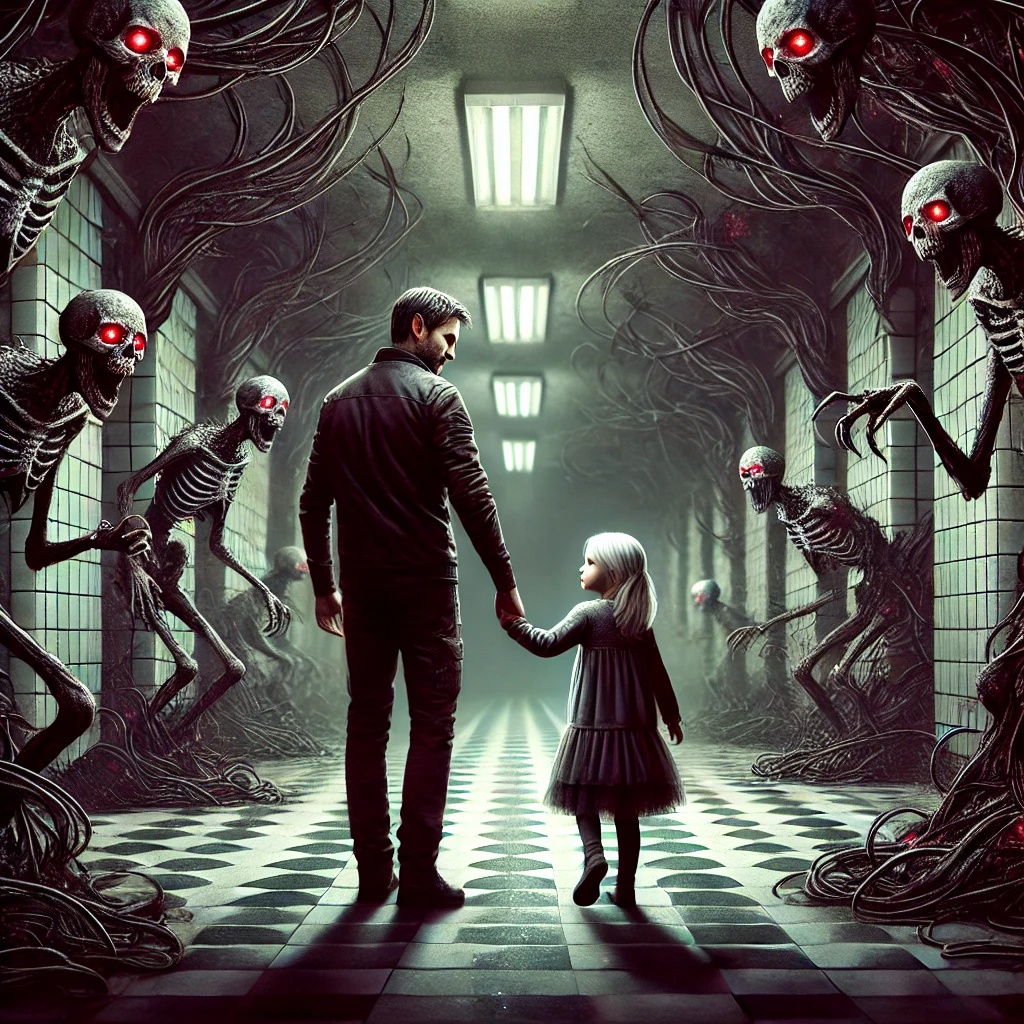 Dark, industrial rock with eerie atmospheres, distorted guitars, haunting vocals, A chilling, intense journey, dispair