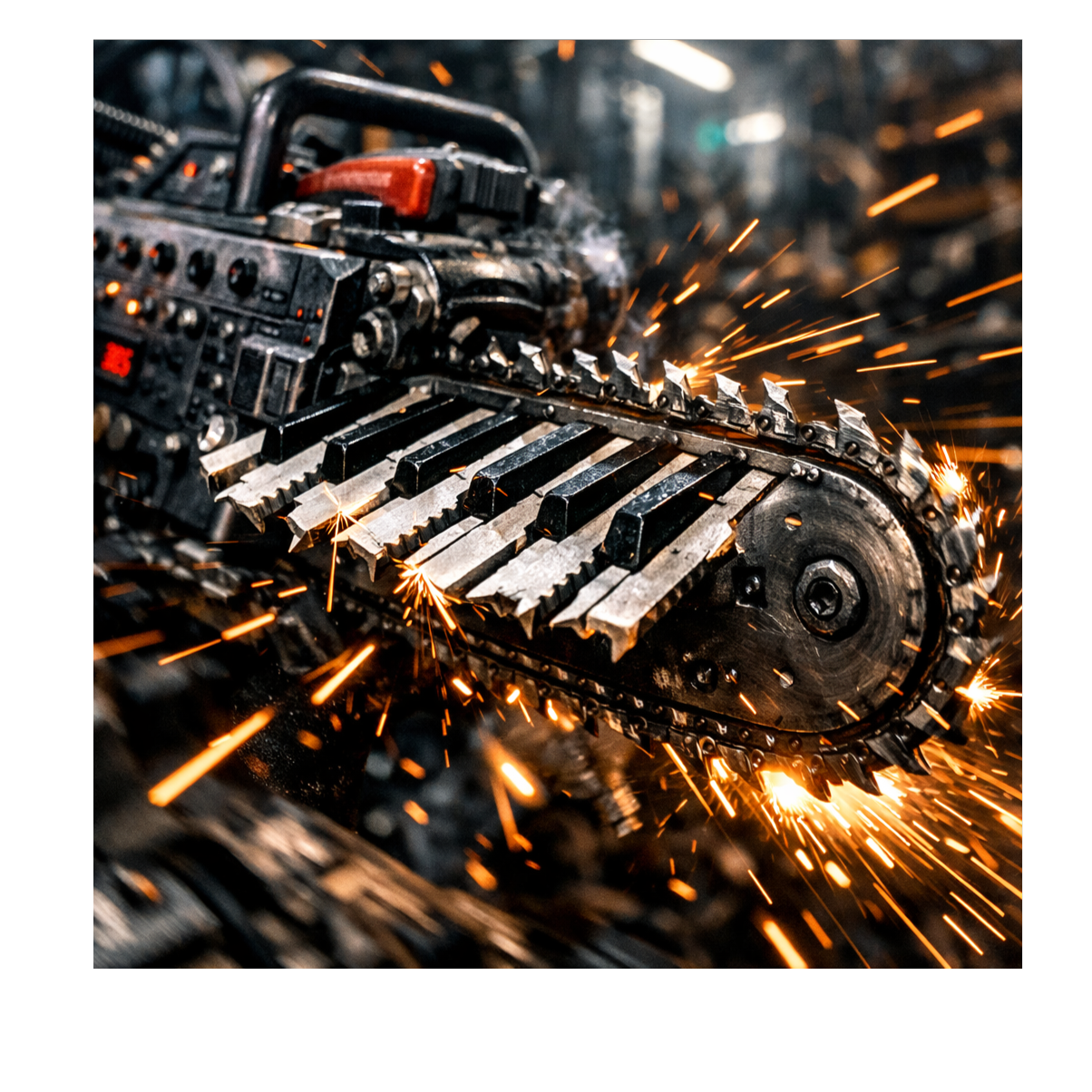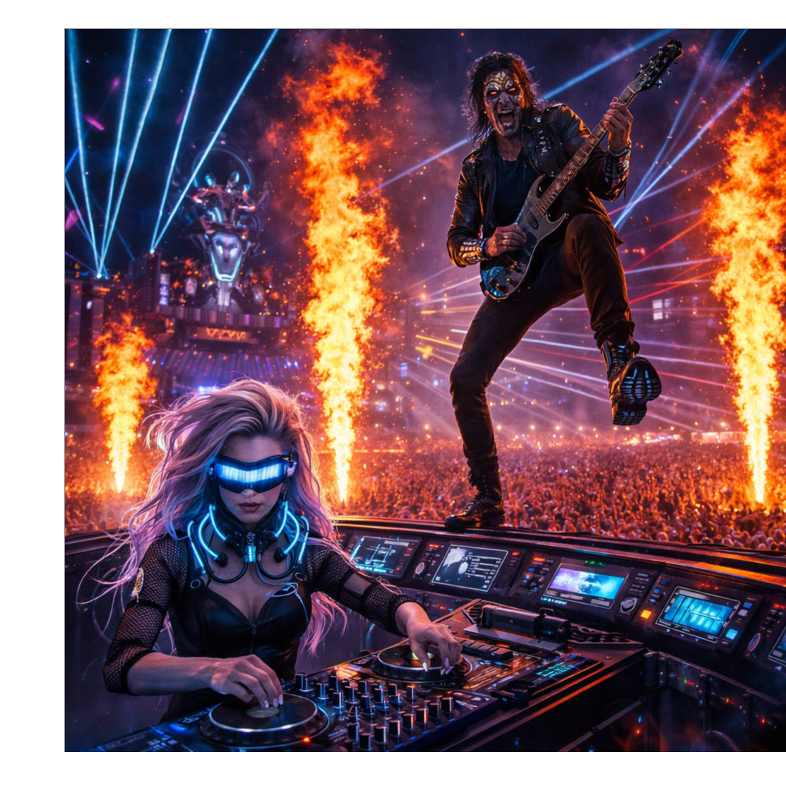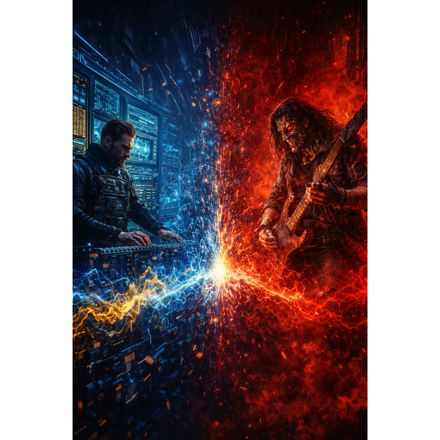 Driving Progressive House, Melodic Techno, Uplifting Trance Elements mix with Industrial Trance, Aggressive Cyberpunk, Heavy Metal Guitar Riffs, 140 BPM, Distorted Synthesizers, Epic Boss Battle, Chaos vs Order, Double Kick Drum, Glitch Metal, High Energy, DJ-friendly transitions, hypnotic dancefloor structure, continuous development over 8 minutes