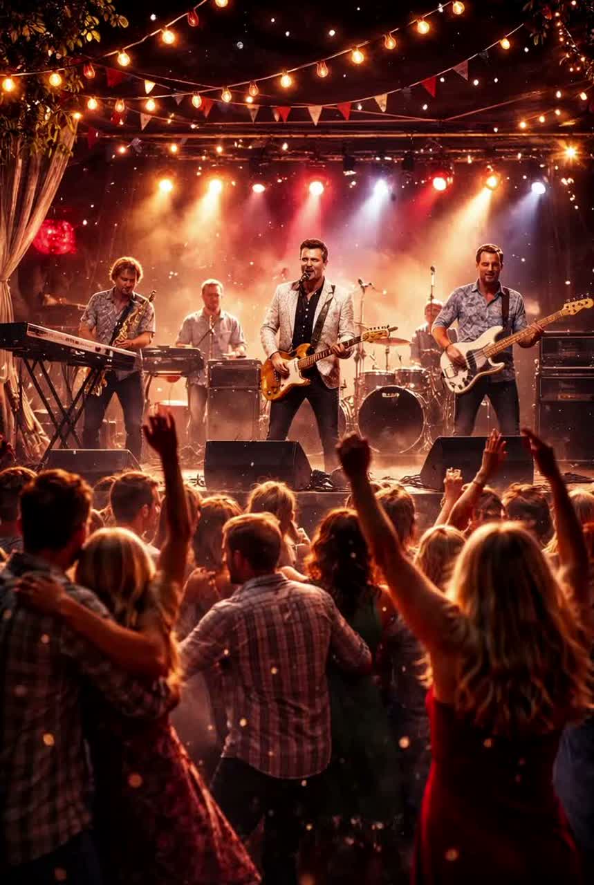 Modern Swedish dansband pop/foxtrot with strong rhythmic drive; steady 4/4 dance tempo, bouncy two-step pulse; bright clean rhythm guitars with chorus shimmer, warm synth pads, electric piano comping, melodic bass; tight punchy drums, tambourine; saxophone + keys carry a lively hook, Big singalong choruses with full melodic stacked harmonies; verses tight, narrative, lightly humorous, Live folkpark stage vibe: front-of-house PA sound, open-air ambience, stage reverb, crowd claps/cheers between lines, band vamping and spoken hype in the intro, Male vocals in Swedish, warm resonant confident delivery with slight seasoned edge; clear diction, grounded tone, Retro textures with modern pacing; arrangement builds: long intro patter → verse/chorus cycles → bridge → instrumental sax solo → lifted final chorus → outro with crowd response