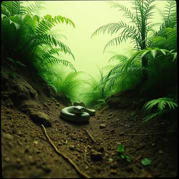 Fast-paced Nyabinghi Reggae track with a driving bass drum rhythm and complex, winding kete drum patterns that suggest movement and latent speed, Use sharp and accented percussion elements (claves) and a pulsating shekere sound to emphasize power and sudden action, The bassline should be deep and resonant, anchoring the size and strength, The melody (if vocals) should convey both the imposing nature and the potential for rapid strikes, Crystal clear sound, highlighting the contrast between the python's size and its surprising speed