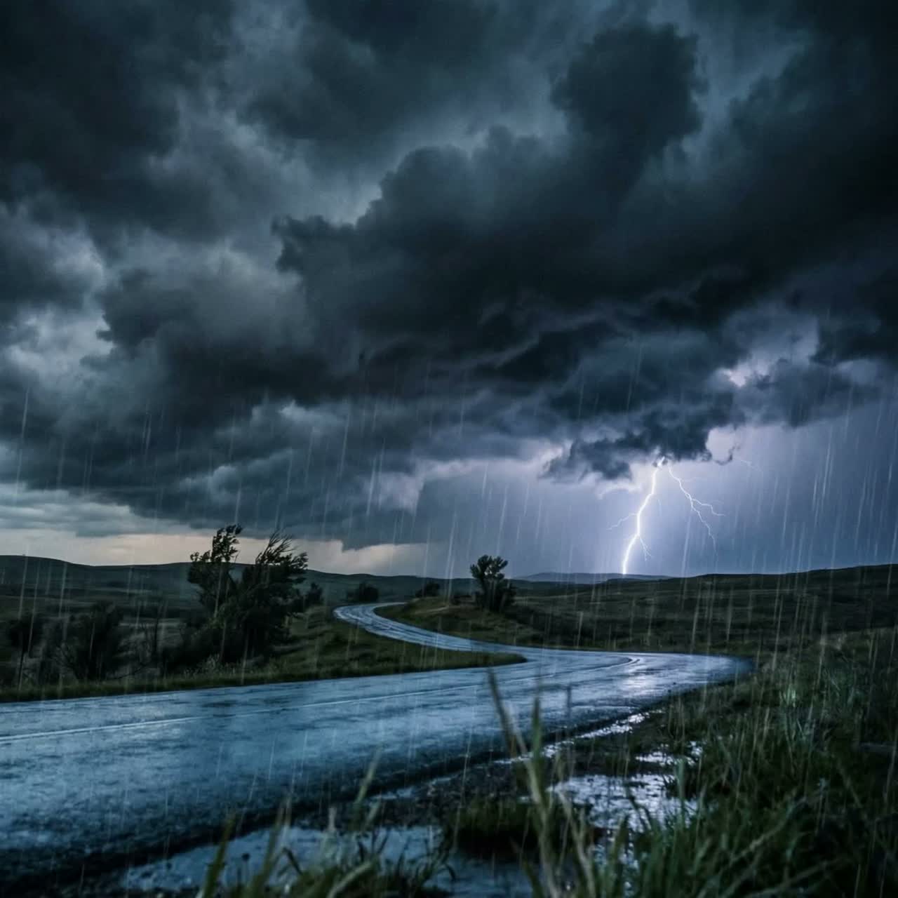 Layers of deep, rumbling drums and low-frequency synths mimic distant thunder, while crisp hi-hats and light metallic percussion replicate rainfall, Occasional bursts of white noise swell like lightning flashes, and ambient pads add a moody, atmospheric depth throughout, use samples of thunderstorms and rain