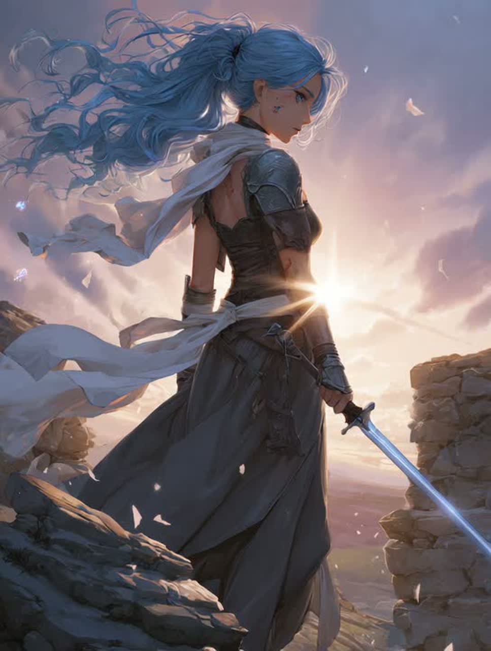 epic fantasy female vocal (low-mid → soaring high on chorus), cinematic rise, female warrior’s theme, orchestral metal ballad, battle between light and darkness, emotional climax