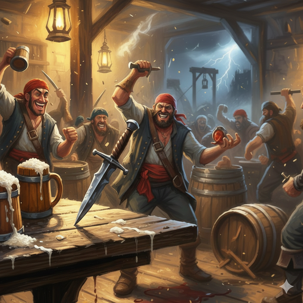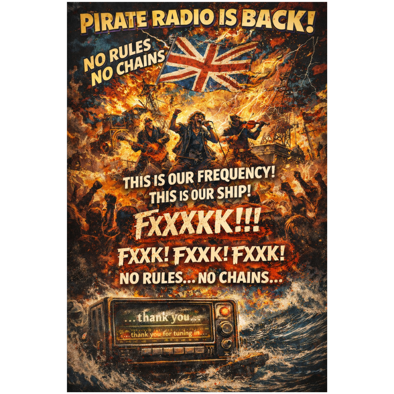 Mood: Chaotic, rebellious, festive, immersive pirate-ship broadcast vibe, sounds like a 70s live rock performance
