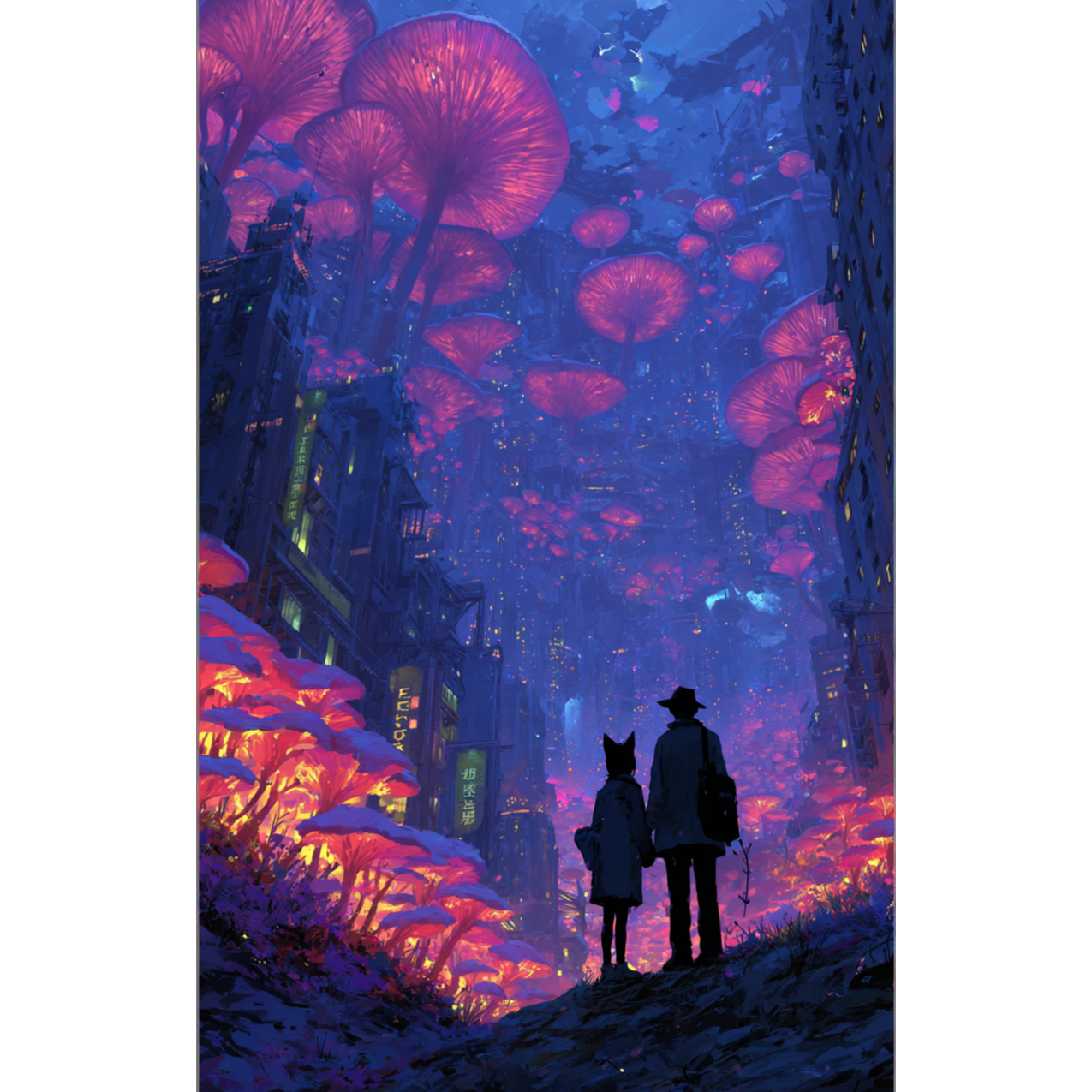 Year 2100 — hyper-futuristic neon city in digital autumn, A glowing future-lined avenue where holographic ginkgo leaves drift like golden data fragments in zero gravity, BPM: 138–145