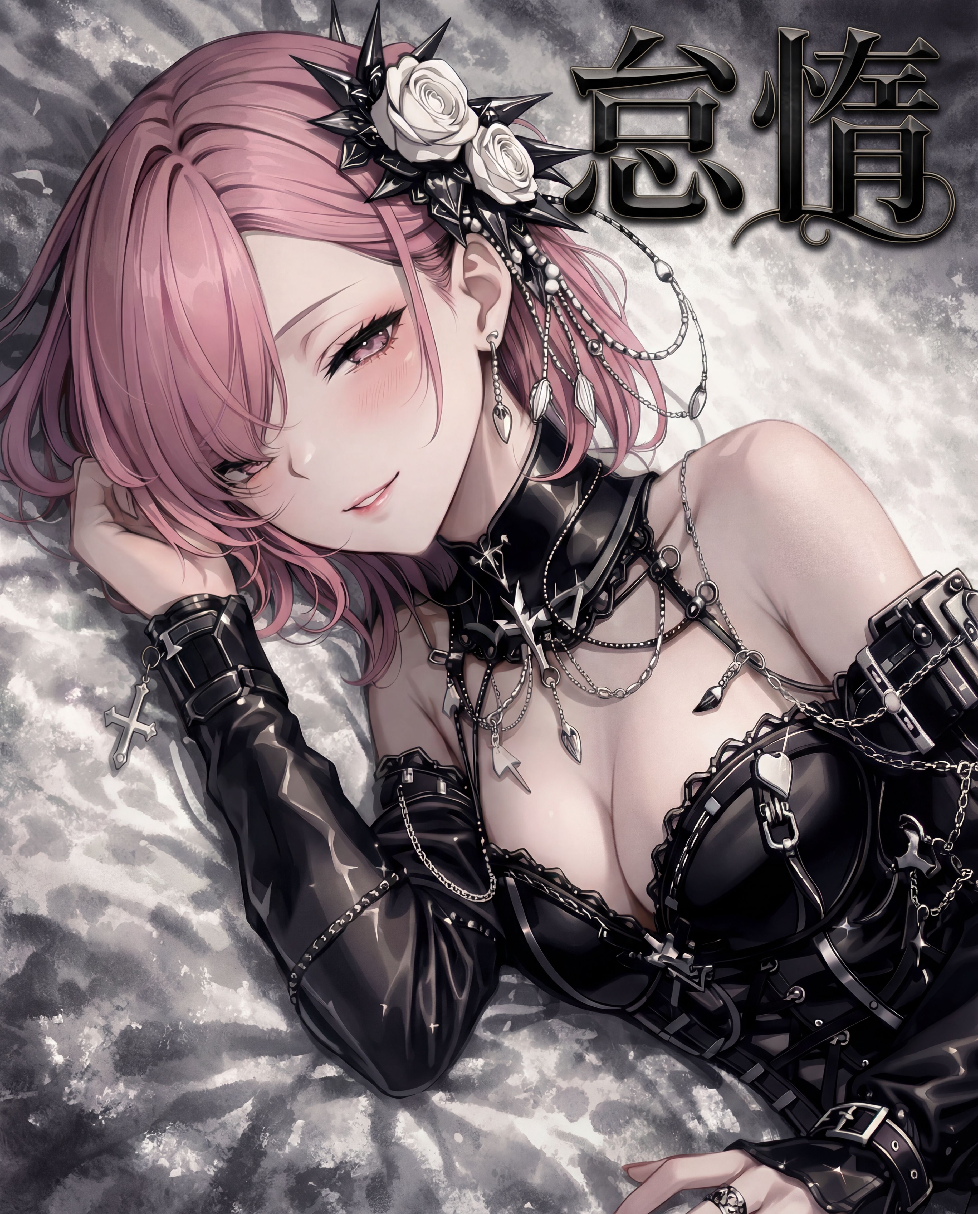 Cyber Visual Kei Electric Rock, BPM124, minor key, Dark, humid, sensual mood, Gothic V-kei atmosphere with modern electronic pulse, Deep sub bass synth with soft sidechain, neon arpeggios, wide smooth Drop A guitars in chorus, Tight deep kick, controlled snare, avoid bright pop tone, Keep sound warm, late-night, intimate, Female vocals only, no male voice, Breathy, seductive, slightly husky lead, Close-mic intimacy in verses, whisper doubles in intro and pre-chorus, Chorus melodic and dramatic with layered harmonies but still dark, Soft controlled female low growl in breakdown, Half-time heavy breakdown with deep synth pulse, Focus on body heat, temptation, lazy pleasure, addictive repetition, End with whispered fade and lingering reverb