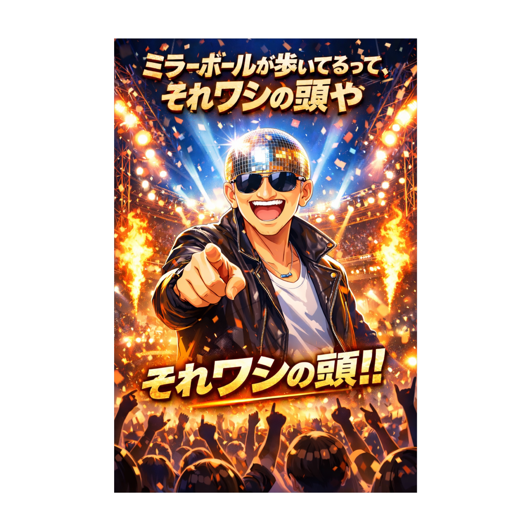 [Polished mastering, wide dynamic range], 90s stadium rock, anthemic arena atmosphere, BPM138, approx4min, huge drums, thick distorted guitars, driving bass, delay lead guitar intro, energetic male vocal, call and response crowd chants, powerful singalong chorus, tempo up and key up in final chorus, dramatic drum fills, big reverb, live concert feeling, lyrics about a bald middle aged man mistaken for a mirror ball, humorous but triumphant tone, chant hook lineそれワシの頭 repeated, breakdown before final chorus, hands up shout section, festival climax ending with massive final hit