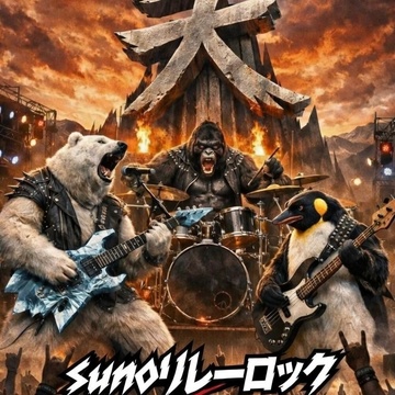 Aggressive distorted guitars with fast downstrokes, heavy live drums, driving bass, Shamisen riffs layered with guitars for a sharp traditional edge, Taiko hits and eerie bells accent transitions, Verses tense and dynamic with stop-and-go rhythm, Pre-chorus builds with rising intensity, Huge explosive chorus with full band impact and gang shouts, Break features virtuosic shamisen solo over pounding drums → final lift, Outro fades with dark festival ambience, Vocal Style: