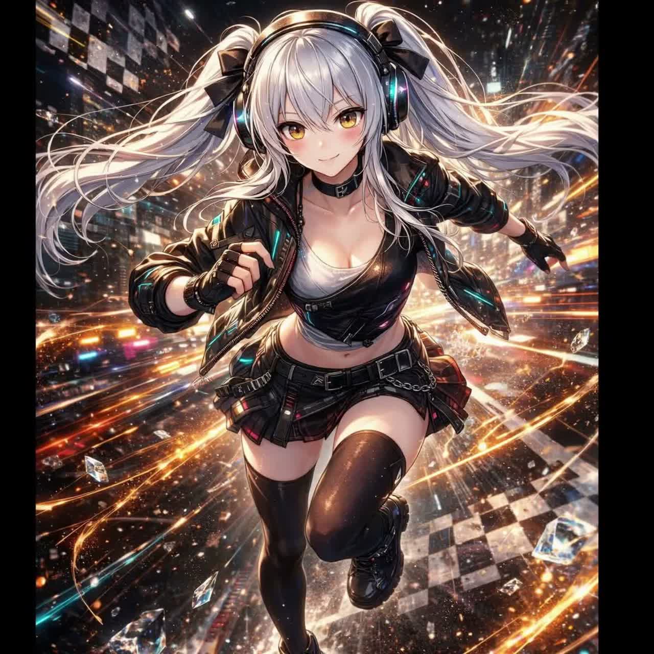 West Coast electro-rock, hyper-chiptune punk, neon L, A, atmosphere, manic glitch-pop energy, cinematic open-world game vibe, 175 BPM, fast tempo, driving 4/4 beat, Rapid-fire rhythmic vocal delivery in verses, anthemic soaring chorus melody with high octave jumps, Catchy J-pop style hook, melancholic yet aggressive chord progressions, Contrast between mechanical verses and emotional explosion in chorus, Distorted punk guitars, bright grand piano riffs, fast 8-bit NES square wave synths, aggressive slap bass, heavy rock drums with tight snare, digital glitch effects, police siren samples, Clear female vocals, very rhythmic delivery and sharp articulation, slightly processed, rebellious attitude, Builds from mechanical intro to explosive wall-of-sound chorus, heavy glitch breakdown in bridge, chaotic double-time finale, No acoustic guitar, no slow tempo, no jazz, no ballad, no lo-fi, no orchestral, no lazy beat, ‑choir