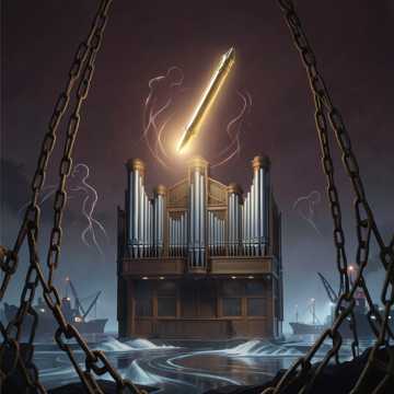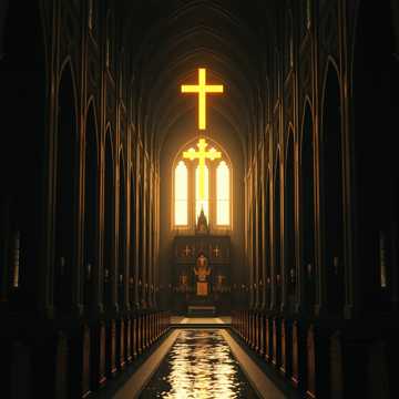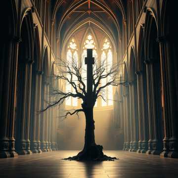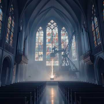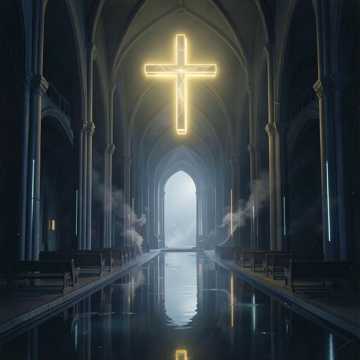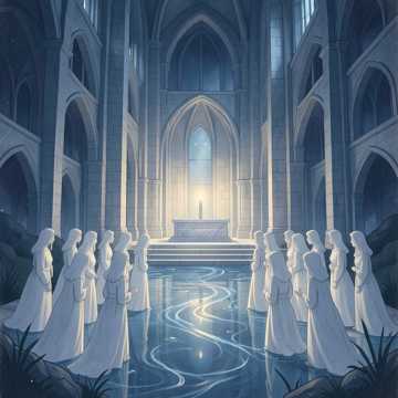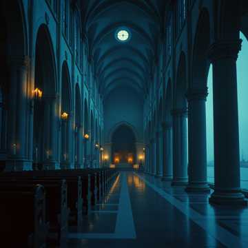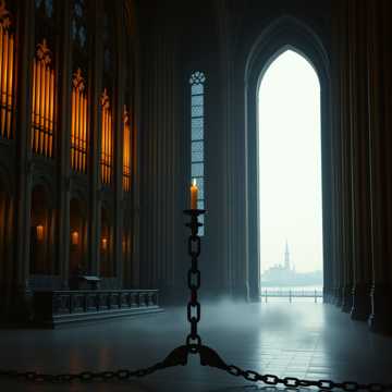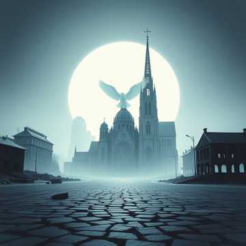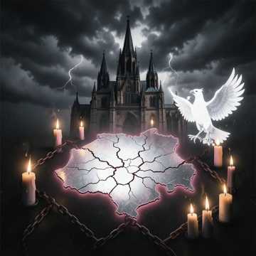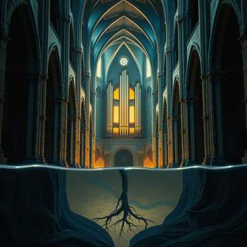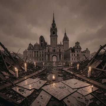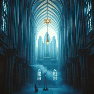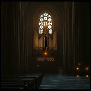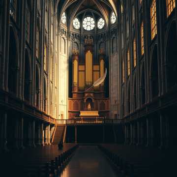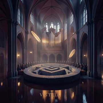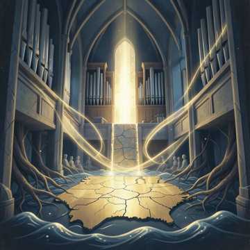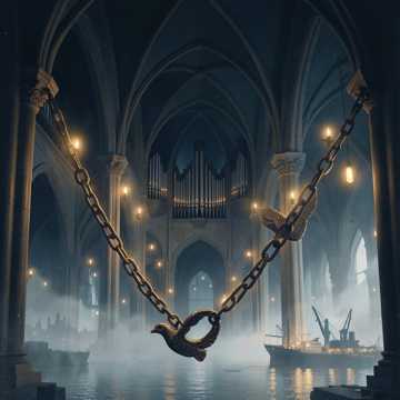 Sacred atmospheric piece, A majestic, deep Pipe Organ playing a somber, slow hymn in a vast cathedral, Ethereal, pure voices of young girls whisper and speak alternately from left to right, surrounding the listener, Spatial audio effect, The tone is emotional, tearful, yet resilient, Background has faint echoes of shipyard clangs and flowing water (Vistula river), Cinematic soundstage, high fidelity, 19th-century requiem style mixed with modern ambient spoken word