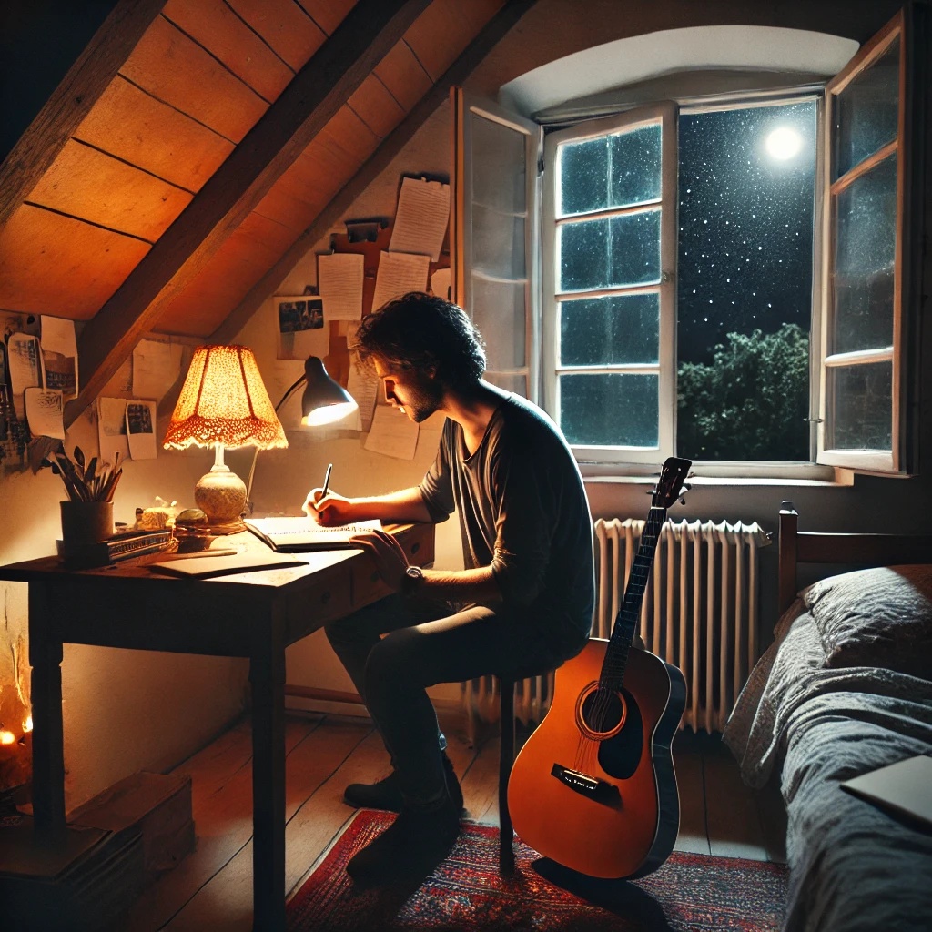 Key: G-major, 105-110 BPM, Warm Spanish male vocal, introspective acoustic folk-rock with poetic lyrics about unspoken love, Gentle fingerpicked Fender Stratocaster, Gentle fingerpicked acustic guitar, storytelling, soft brushes, ambient textures, Mood: nostalgic, emotional, cinematic, melancholy, nostalgic, longing, unspoken love, warm Spanish male vocal, acoustic, folk, romantic, introspective, soft, cinematic, intimate