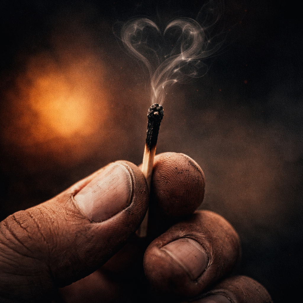 Style : emotional modern country with Americana influence; honest, reflective, restrained but powerful, Tempo: slow to mid-tempo, natural push and pull, not rigid, Instruments: leading finger-picked acoustic guitar as the emotional anchor; warm overdriven electric guitar swells and melodic fills (no heavy distortion); sparse drums that enter only in key sections (brushes, rim hits, soft kick); subtle pedal steel or bowed string ensemble (violin/cello) for atmosphere; optional piano pads for depth, Arrangement: starts intimate and stripped; builds gradually with drums and strings; drops back to acoustic for emotional moments; final chorus fuller but still organic, Vocals: intimate, vulnerable male vocal; natural phrasing, slight grit when emotional; no vocal effects beyond light reverb and compression, Production: warm, natural, dynamic mix; audible room tone; wide stereo acoustics, centered vocal; emotional realism over polish, Mood: reflective, bittersweet, honest, quietly cathartic