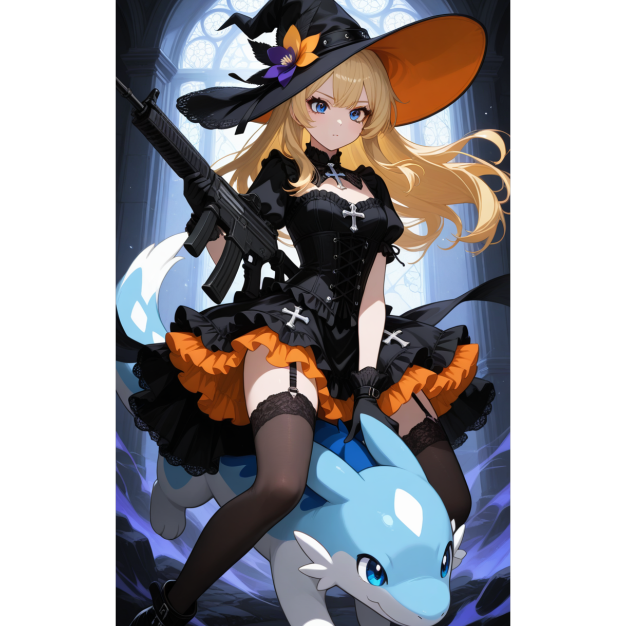 High-energy chaos-rock crossover blending pop-punk, ska-punk, novelty comedy, and meme-rap, Tempo fluctuates 128–165 BPM with whiplash drops and sudden stops, Mood is absurd, playful, and unpredictable, Female lead vocal with witchy confidence, playful menace, and strong power-notes, including spoken swagger and breathy comedic asides, Backing vocals feature shark-choir chants, chip-harmonies, and gang shouts, Guitars are crunchy alt-rock with fuzz, sporadic metal chugs, and surprise shred cameos, Drums use big-room kicks, double-kick surges, abrupt pauses, and startle hits, Percussion includes broom-hits, pot-clanks, and kazoo-breakdowns, Bass is distorted and sub-heavy, Synths use 8-bit sparkle and glitter arpeggios, FX include bubble-bursts, reverse-potion swells, underwater reverb drops, and notification stings, Arrangement embraces chaos: sudden polkas, bridge chaos-mode, fake endings, and comedic silence, Energy is volatile-comic with a glossy, chantable hook