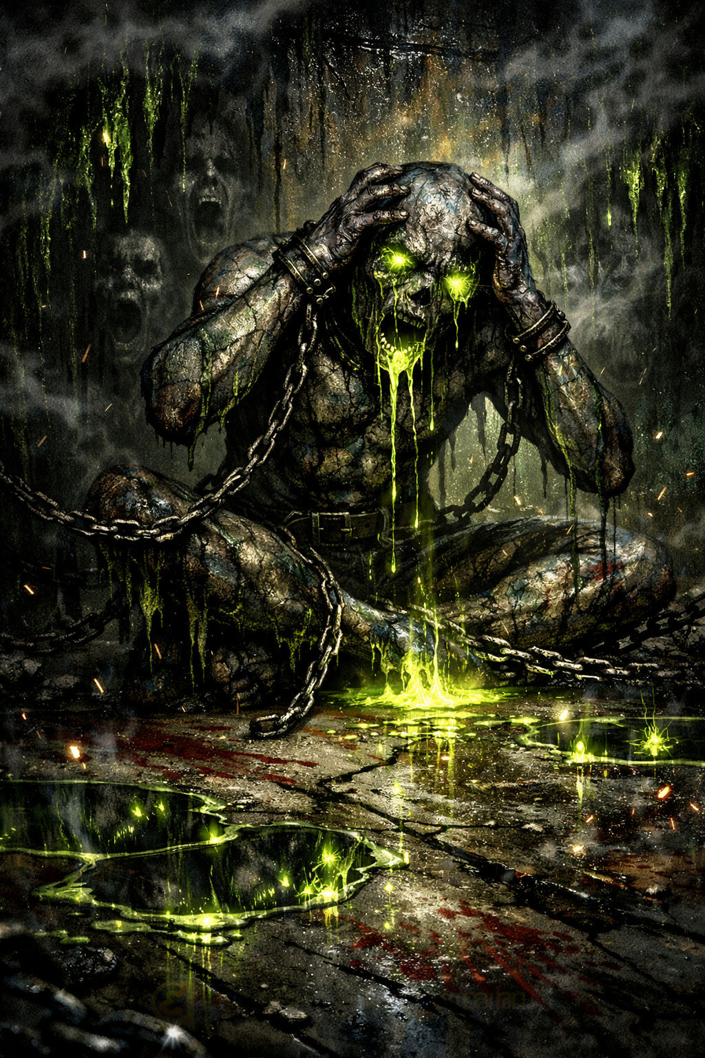 The track fuses circus polka rhythms with double-kick metal drums, bellowing distorted guitars, and frenzied calliope organ, Melodic candycore synth leads sprinkle brightness throughout, while blistering deathstep drops feature aggressive bass and glitchy breakdowns, Dynamics whip rapidly, blending ferocity and playful chaos, Full-on corrosive rock song about being trapped in a toxic relationship, Imagine acid dripping in veins, poison words like blades, screaming and clawing to escape but stuck in the chaos, Distorted, gnashing guitars, hammering drums, chaotic breakdowns, and raw, venomous vocals, Think Death Metal Band: aggressive, chaotic, dark, painful, visceral, emotionally corrosive, Build tension with pre-chorus whispers, explode in choruses with shouting, add breakdowns that feel like the soul being shredded, Mood: unrelenting, acidic, suffocating, addicted to the pain, almost nightmarish, electronic dance music (edm), punk ska, indie pop, roland tr-808 drum machine, balafon