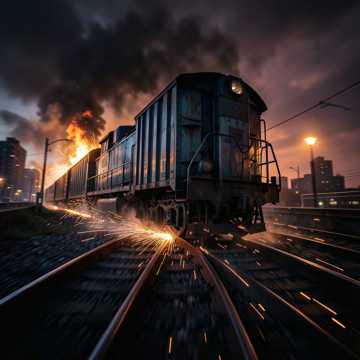 Genre: High-Octane Action Score, Industrial Thriller, Orchestral Chase, Adrenaline-Fueled Escape, Mood: Frantic, Desperate, Urgent, Relentless, Hopeful but Perilous, Last-Ditch Effort, Instrumentation: Fast, driving electronic percussion, pulsating synth basslines, urgent and rapidly bowing string sections, powerful brass stabs, industrial sound effects (metal screeching, train sounds), Atmospheric Sound Effects: Train horn, fast-moving train sounds (wheel on tracks), distant explosions, weapon fire, heavy breathing, sudden impacts, Tempo: Very fast, driving, accelerating, relentless, Dynamics: Intense and loud, with brief, sharp moments of respite before renewed urgency, Vocals: Strained, breathless, determined, almost shouted narrative, conveying sheer will to survive