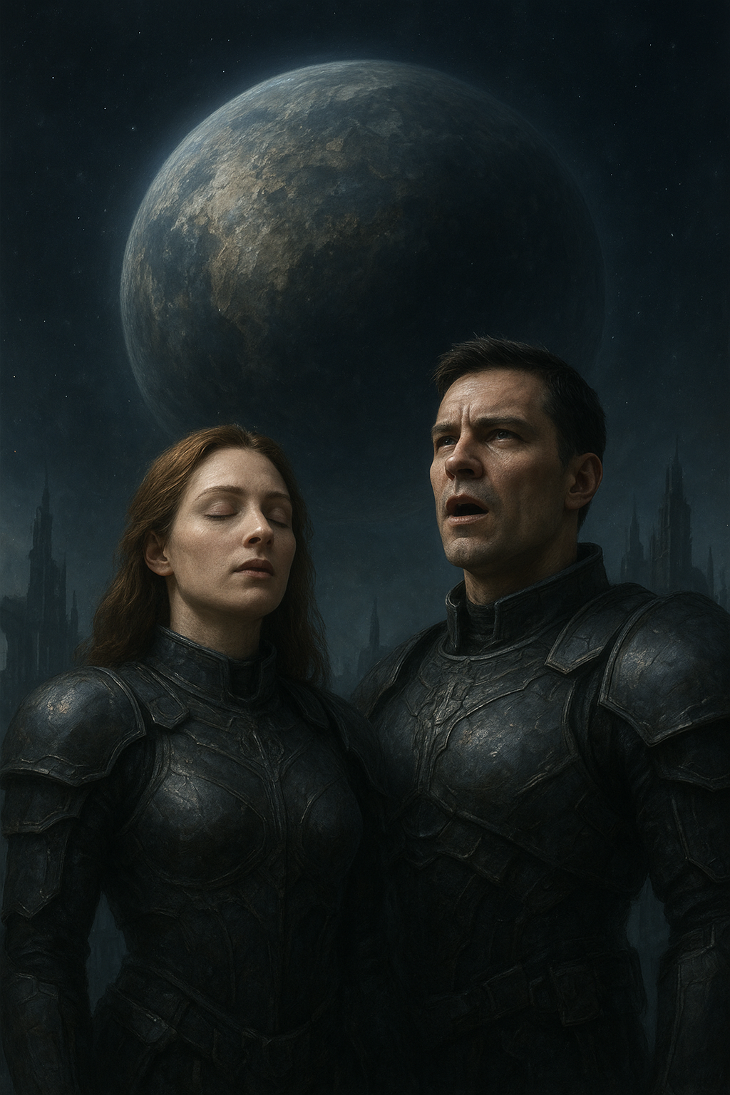 Epic symphonic requiem with full orchestra, dramatic strings, deep brass, and slow tolling percussion, Dark futuristic atmosphere with hints of cosmic horror, Female soprano and male baritone in a duet, trading lines and joining in powerful harmonies, No backing vocals, only the two lead voices, Grand, operatic, emotional, with long sustained notes and wide reverb in a cathedral-like sci-fi space, Inspired by symphonic arias, cinematic space operas, and post-human myth, Slow to mid tempo, solemn and heroic, with rising climaxes