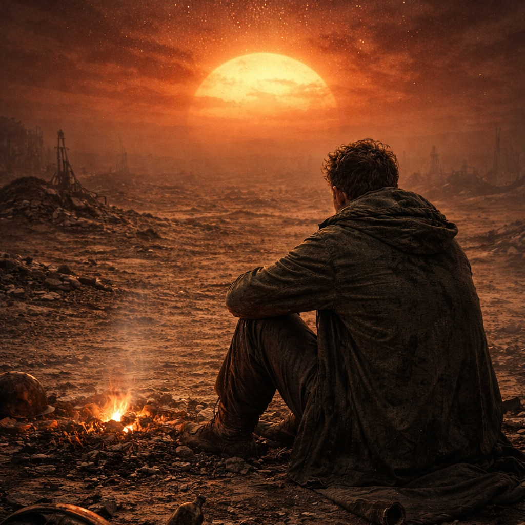 Slow cinematic ballad, sci-fi melancholy, emotional male vocal, sparse piano, atmospheric pads, gradual orchestral build, reflective and tragic tone