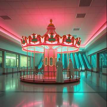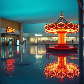 (very slow ~68–74 BPM, thick chorus-y synth pads drenched in cassette wow & flutter, distant bright Rhodes piano, faint gated reverb snare brushes, soft 80s string machine swells, breathy layered vocals with light vocoder shimmer on the choruses, subtle vinyl crackle & tape hiss throughout, overall feeling like wandering an abandoned shopping mall at 2 a, m, in 1989 while the carousel music keeps looping forever)