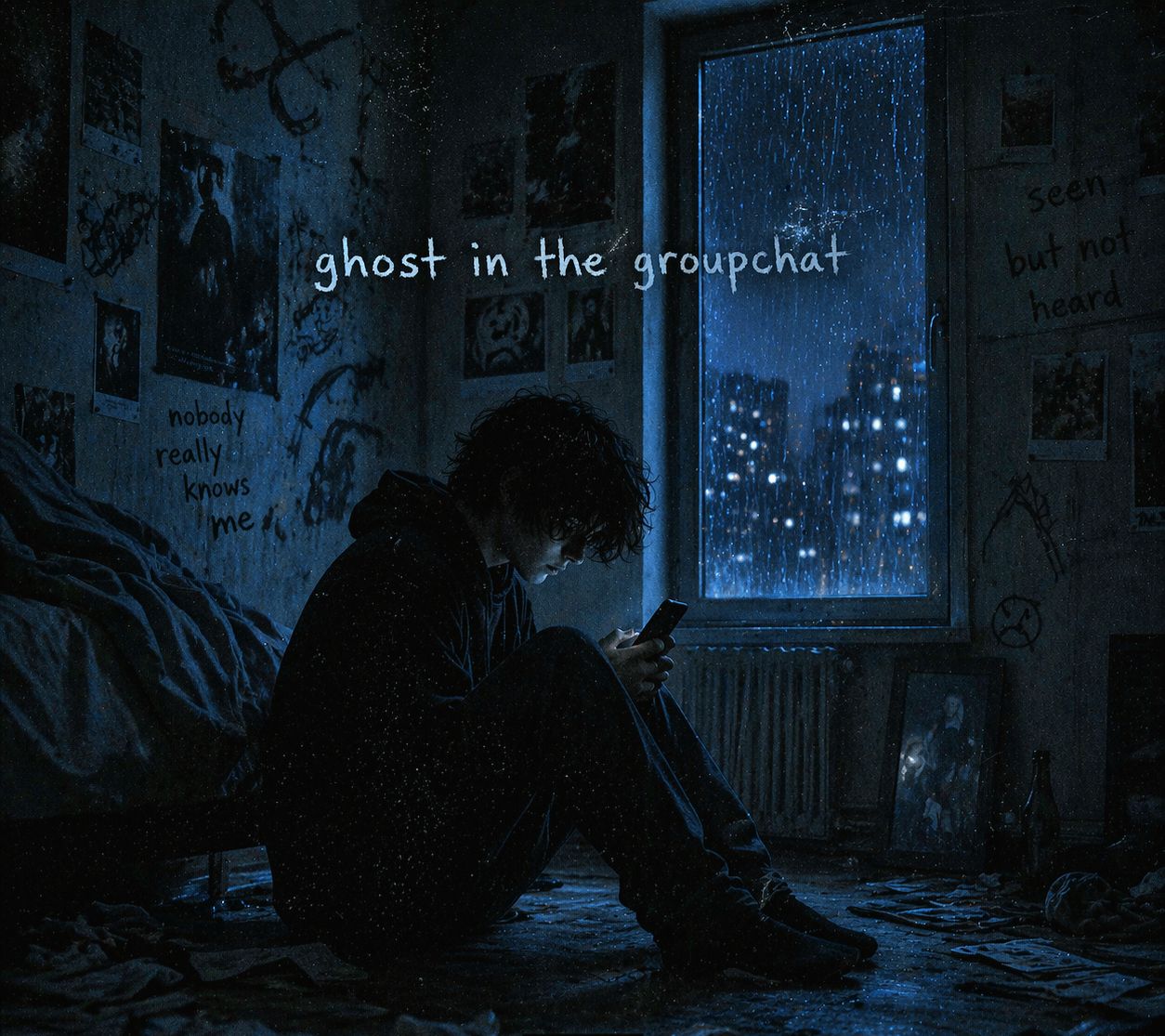 Modern indie pop hit, Male vocalist (warm, slightly raspy, emotional), Tempo 110 BPM, 4/4, Bright-but-bittersweet vibe: shimmering synths, clean chorus guitars, punchy tight drums, melodic bass, subtle vocal harmonies, airy reverb, Theme: being constantly online yet deeply lonely — 2AM doomscrolling, blue phone glow, feeling invisible in a digital crowd, Make “ghost in the group chat” the main hook line (repeat it in the chorus), Lyrics in English with vivid modern details (group chat, read receipts, late-night scrolling) but poetic and relatable, Structure: Verse 1 / Pre / Chorus / Verse 2 / Pre / Chorus / Bridge (half-time, emotional lift) / Final Chorus bigger with extra harmonies