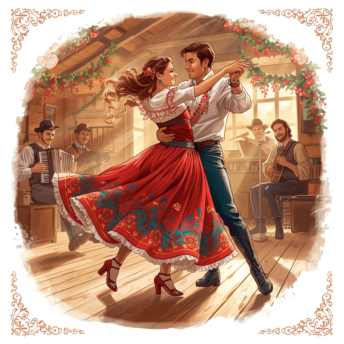 Create a chaotic, hilarious New Year folk-punk / cabaret rock song, Fast tempo (150–170 BPM), The mood is wild, absurd, hysterically funny — like a magical winter festival gone off the rails, Use aggressive cello riffs with pizzicato, energetic electric guitar riffs, shamanic frame drum as a driving pulse, and bright pioneer horn fanfares as comic accents, Add occasional brass for over-the-top “epic parody” moments, Male vocal: playful, expressive, suddenly jumping between whisper, shout, and theatrical storytelling, Add group shouts and chaotic children-like chorus during the refrain, The music should escalate every verse — more chaos, more absurdity, like a cartoon snowball of madness rolling downhill, Energetic, punchy, loud, festive, insane, Goal: a song that makes the listener burst into uncontrollable laughter and feel like they’re in a drunken fairy-tale riot
