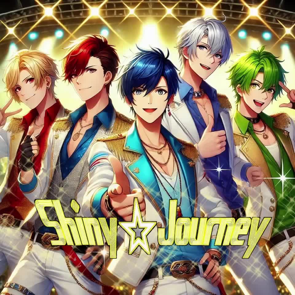boys group, j-pop, idol pop, ska, latin pop, anime style, energetic, catchy chorus, many male vocals, call-and-response, upbeat, concert style, live performance, sparkling, uplifting, teenager vibe, colorful, danceable, fun, harmony, fast-tempo, synthwave