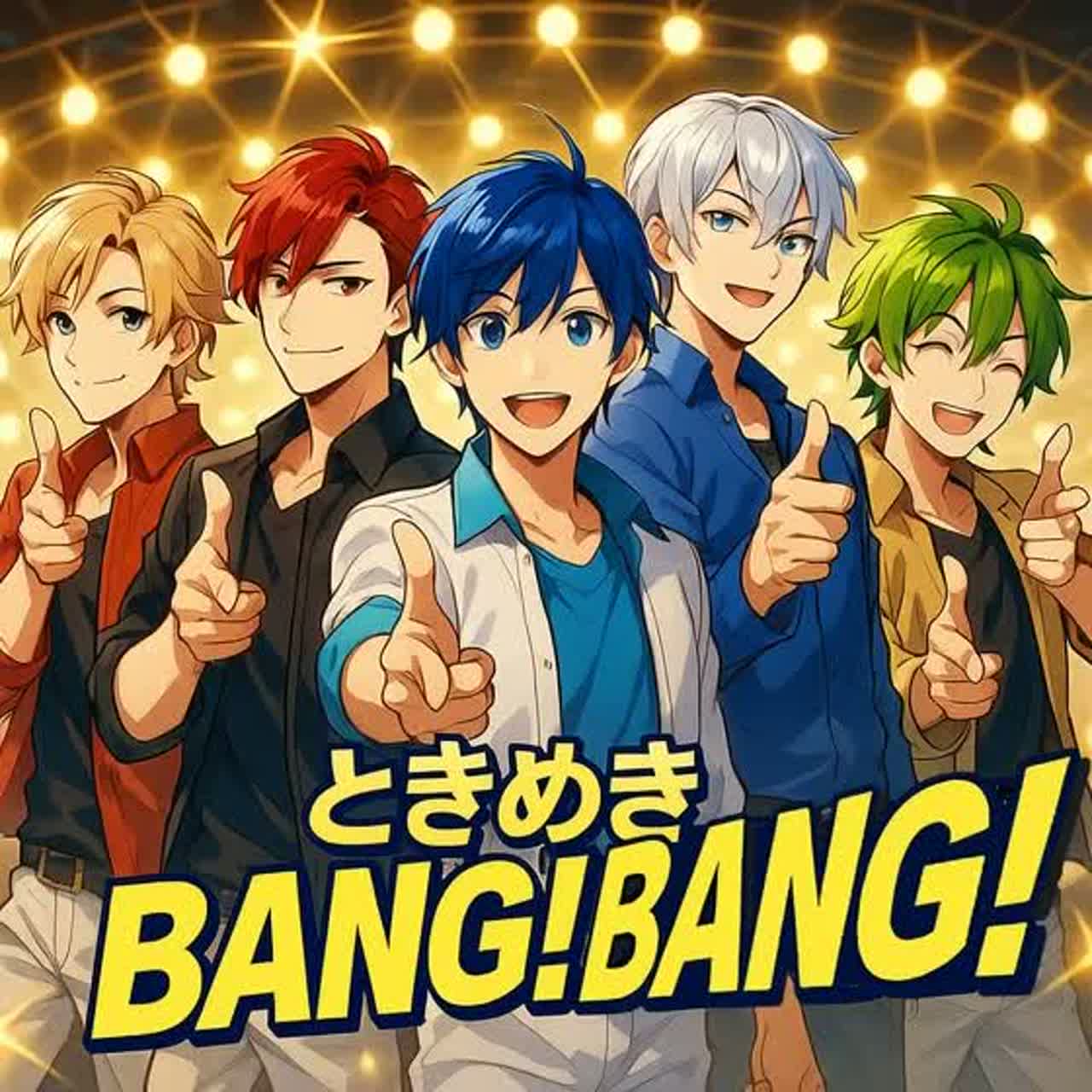 energetic J-pop, fast-tempo, cute male vocal, boy group, anime style, idol concert, call-and-response, catchy chorus