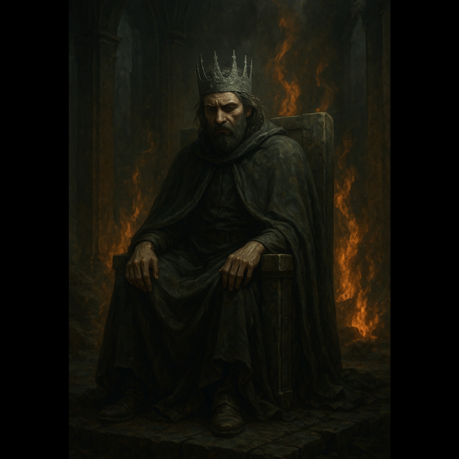 Dark, theatrical 1970s-style hard/prog rock song with powerful male vocals, Features distorted electric guitar riffs, Hammond organ swells, dramatic vocal harmonies, and a fierce vintage-style guitar solo, The mood is intense, brooding, and epic, evoking a fallen kingdom and the weight of regret, Song builds with dynamic shifts, from moody verses to a thunderous chorus, Inspired by bands like Uriah Heep and Deep Purple, Production is analog-flavored, gritty, and atmospheric, with layered instrumentation and a haunting outro