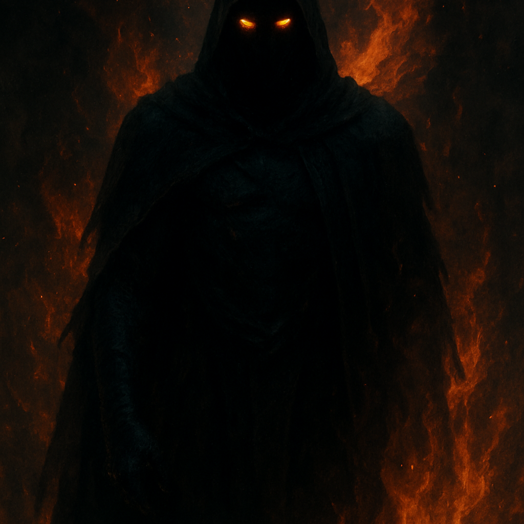 Dark and mystical 1970s progressive rock track with theatrical male vocals, layered vocal harmonies, haunting Hammond organ, and powerful electric guitar riffs, Features eerie melodic passages, a stormy instrumental section with a dissonant guitar solo, and a grand, cinematic chorus, The mood is ominous and atmospheric, evoking themes of prophecy, fate, and isolation, Lyrical content centers around a mysterious, timeless being who observes but never intervenes, Suitable for fans of Uriah Heep, King Crimson, and the darker edge of classic prog rock