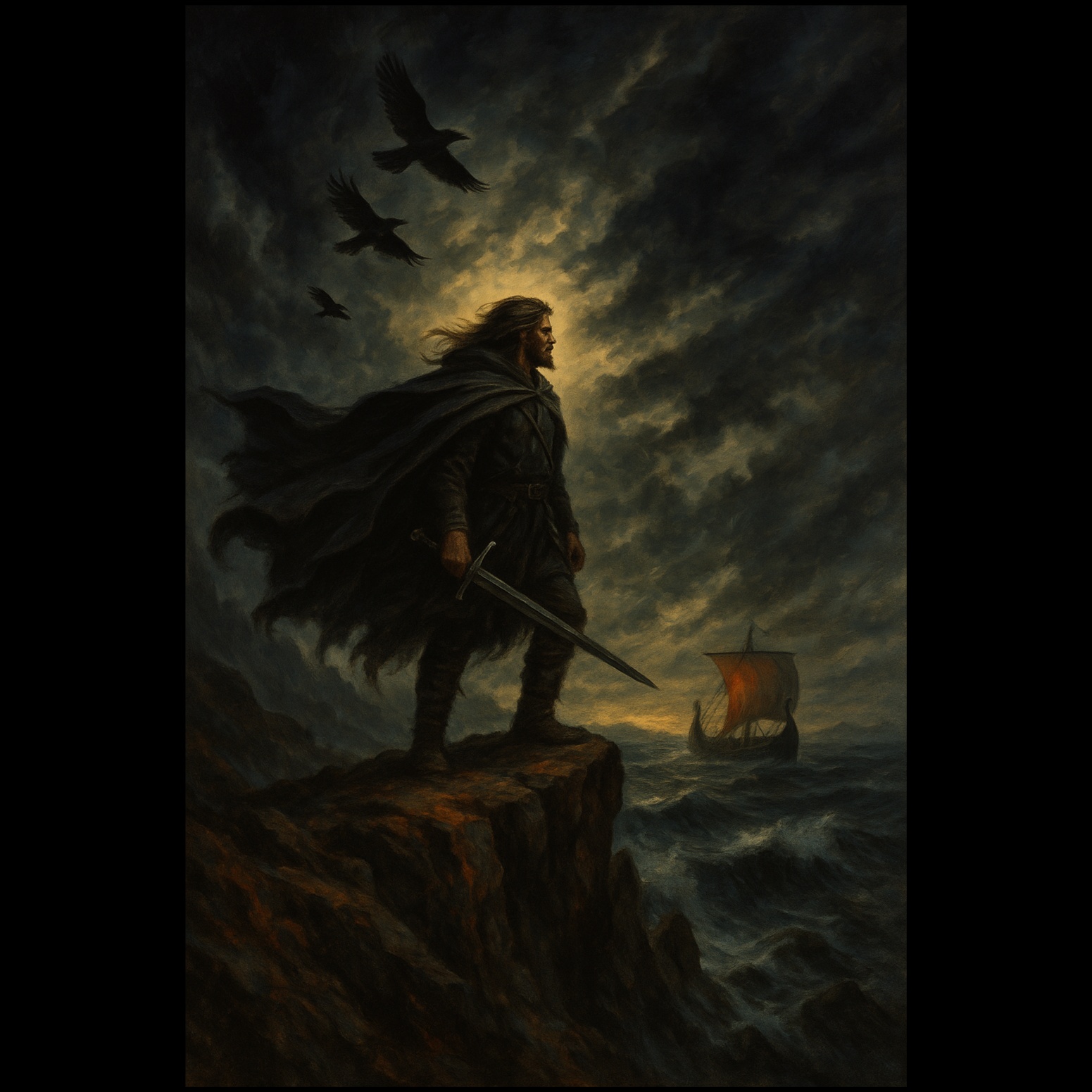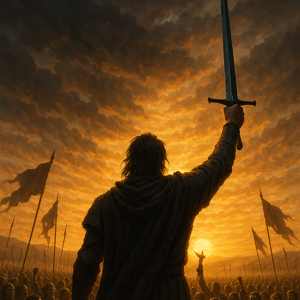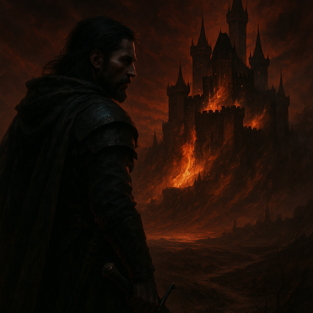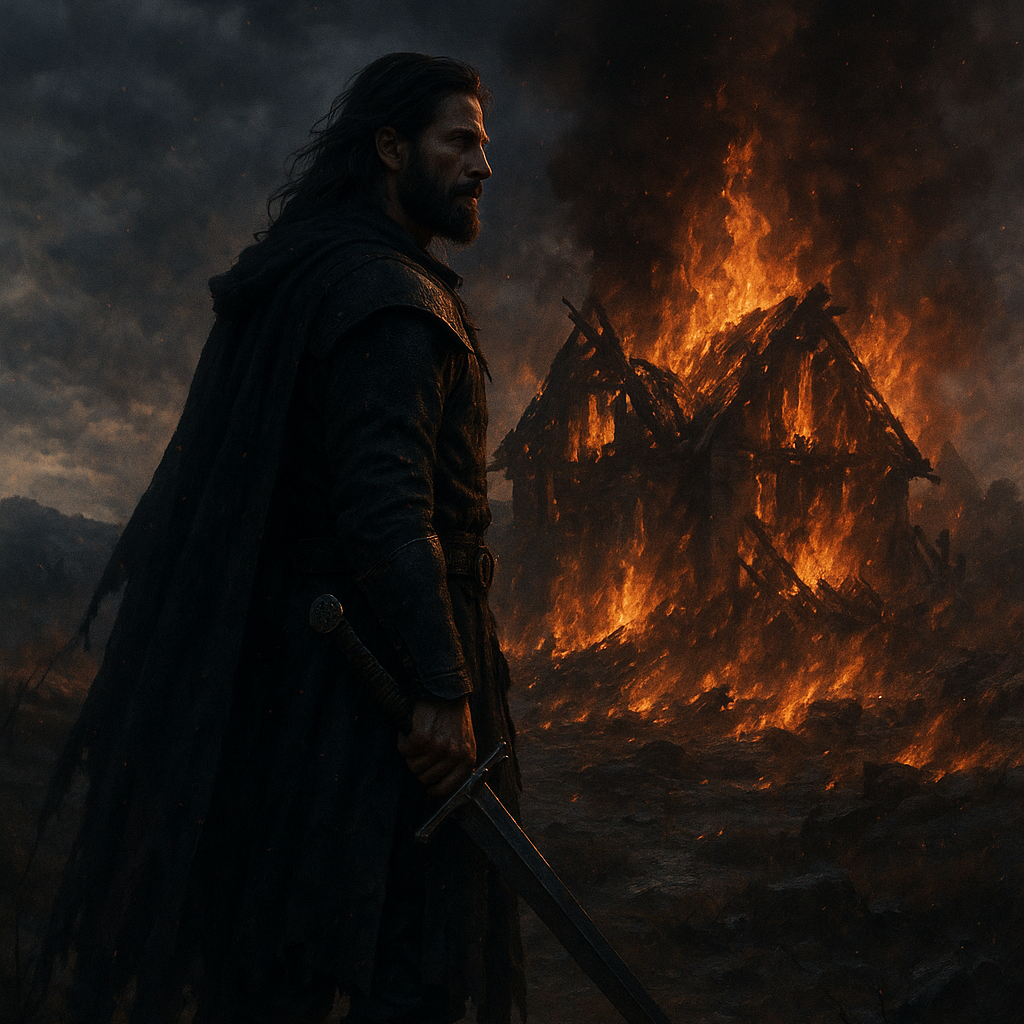 Epic 1970s-style rock ballad with dark fantasy elements, Begins with a slow, haunting Hammond organ intro and soft orchestral textures, evoking sorrow and ruin, Male vocals enter gently but emotionally, building in intensity with powerful phrasing and dramatic presence, The song gradually expands into a soaring, hard-hitting rock anthem featuring heavy electric guitar riffs, rich Hammond organ swells, and cinematic string backing, Includes extended instrumental break with Hammond and electric guitar solos in a minor key, The mood is tragic, vengeful, and heroic—perfect for the rise of a warrior returning to ruins and seeking justice, Ends with a slow, brooding outro