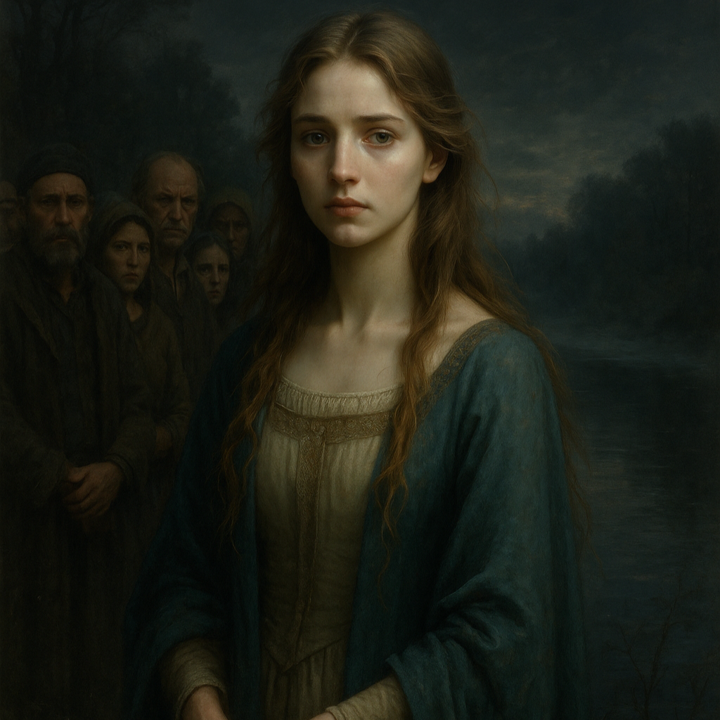 Emotional 70s-inspired rock ballad with soulful male vocals, Features vintage electric guitar, warm Hammond organ, steady acoustic drums, melodic bass, and atmospheric textures, Slow tempo with a haunting yet beautiful mood, expressing sorrow and betrayal, The arrangement gently builds from a soft, reflective verse to a powerful, emotional chorus with dramatic guitar and organ swells, Introspective and melancholic, evoking the tragic story of a kind woman condemned and betrayed, Clean studio sound, organic analog warmth, rich vocal harmonies, and heartfelt performance throughout