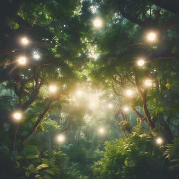 An orchestral piece blended with consistent ambient sounds, Dreamy jungle soundscape, The vibe is ethereal, dreamy, and peaceful, male vocals, female vocals, soft throat humming