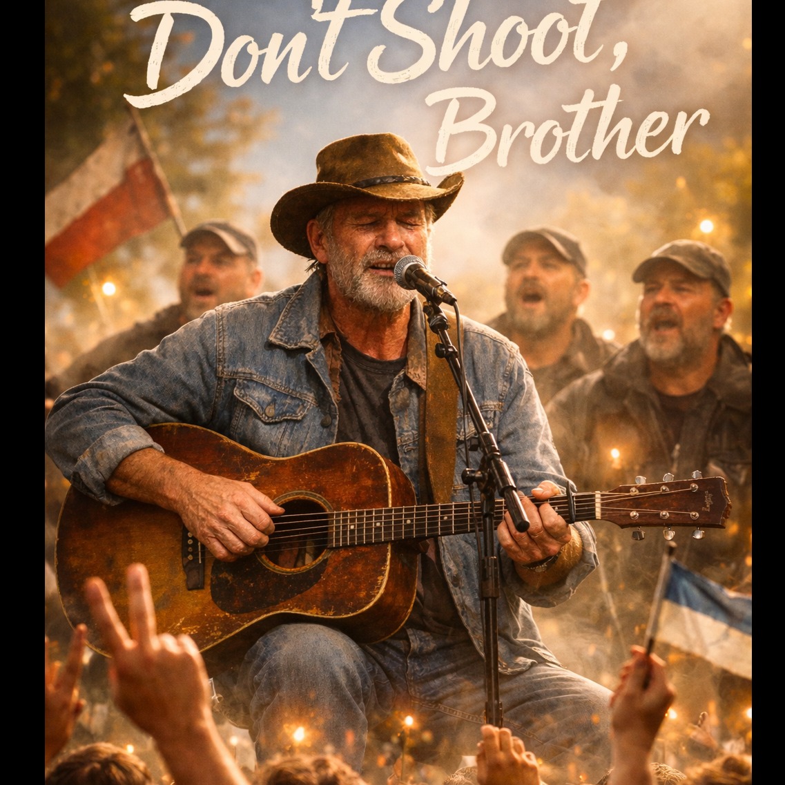 Live acoustic country/folk ballad, 78–84 BPM, key G major (or A major), One instrument only: solo acoustic guitar (fingerpicking verses, gentle strum in choruses), no piano, no drums, no bass, no other instruments, Mature male vocal, raspy and close-mic, emotional, Strong concert ambience: clearly audible crowd noise throughout, cheers and whistles, applause at start and end, Add crowd call-and-response and quiet-to-loud singalong on key chorus lines, especially final chorus, Natural venue reverb, raw live recording feel, minimal processing, dynamic performance, ‑piano, ‑drums, ‑bass, ‑pedal steel, ‑fiddle, ‑synths, ‑strings, ‑choir harmonies (only crowd), ‑heavy autotune, ‑studio-polished pop mix, ‑artificial crowd samples, Male vocalist, gravelly yet melodic, soulful delivery, 1970s singer-songwriter, vocalist, deep, warm soprano, very subtle male choir, distant background harmony, low volume, lead vocal dominant