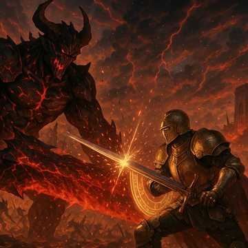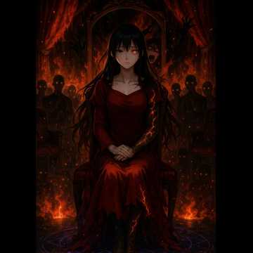 The tragic final chapter in the war between the goddess and the Demon King, This cinematic metalcore epic builds around her desperate last stand—refusing to kneel, even as hope burns to ash, Drop B ESP guitars roar with crushing doom riffs and sorrowful tremolo leads, while double bass drums thunder beneath her cries, The music swells with haunting tension: guttural screams of defiance, clean echoes of fading light, and ambient decay trailing every note, The Demon King’s laughter breaks through it all—unyielding, mocking, eternal, She stands alone, unbroken, but doomed